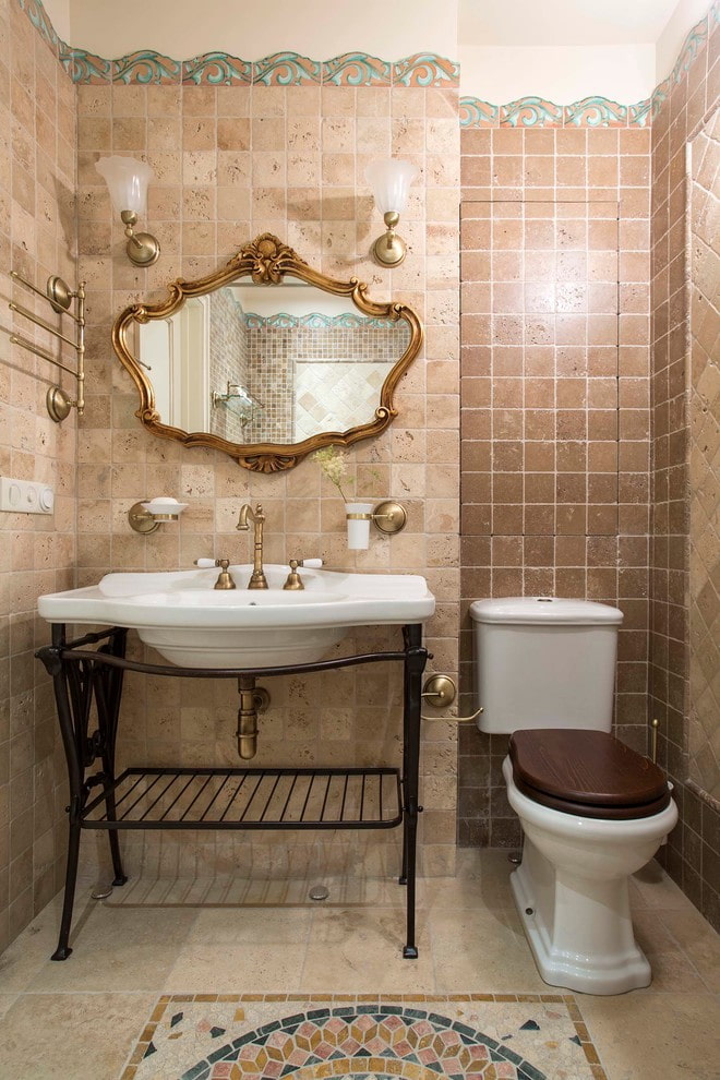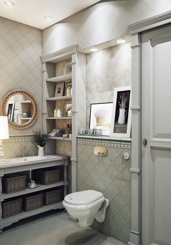 In the design of the toilet, semi-antique plumbing is appropriate, for example, a toilet equipped with a hanging cistern, or a sink, complemented by faucets with valve taps. As an accent, they select a mirror in an openwork frame or tiles with a floral print, small bouquets or meadow grass.
