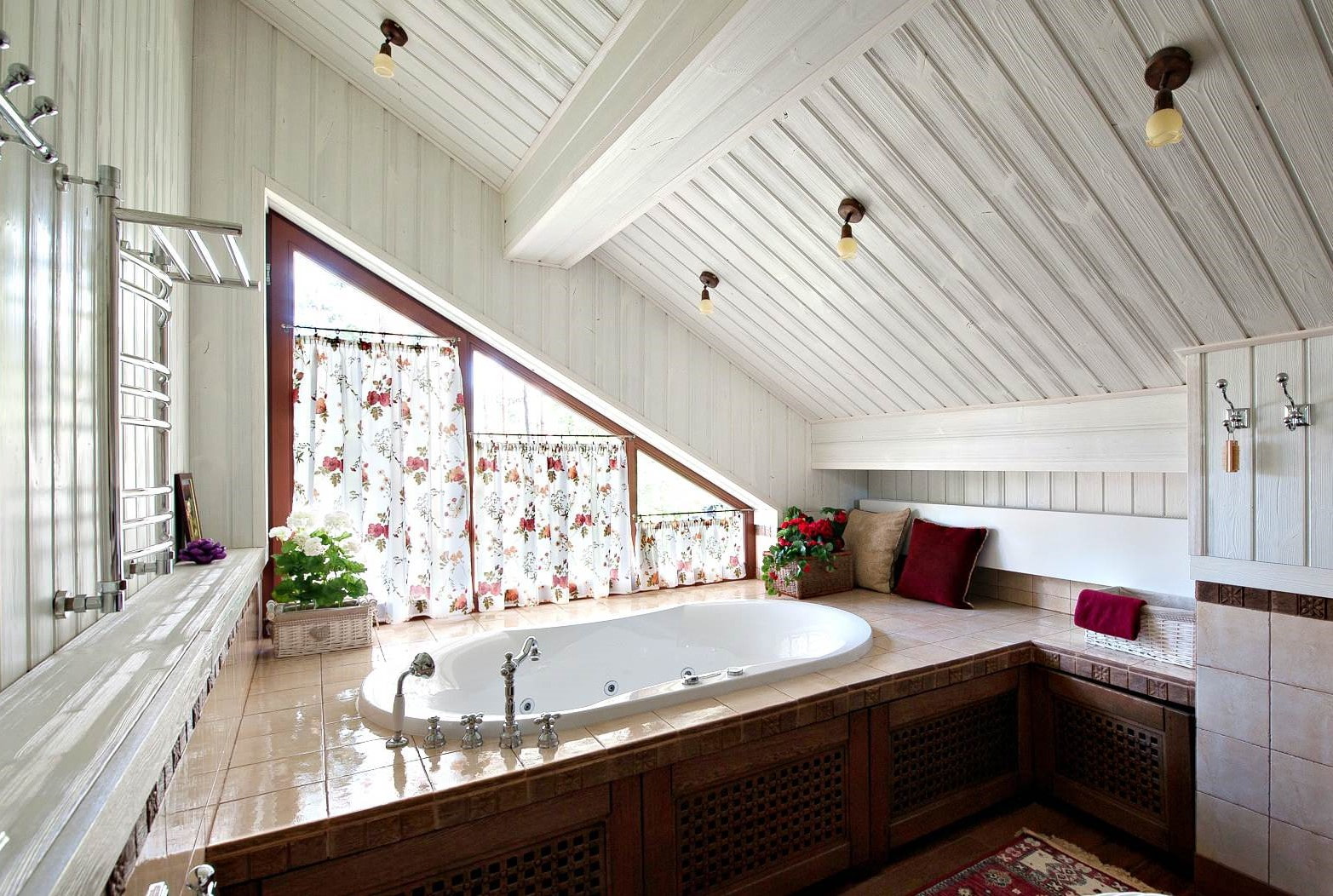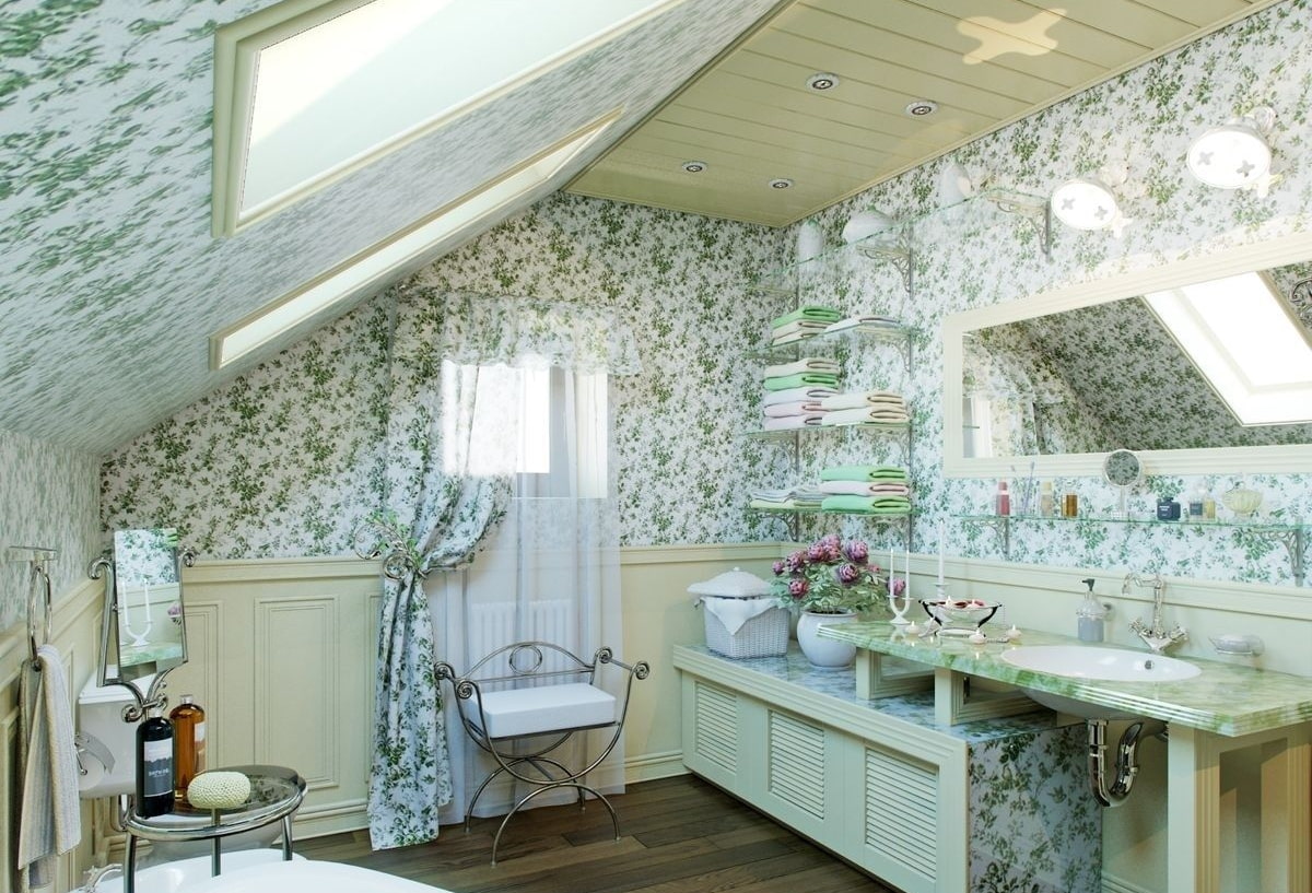 The photo shows an example of a color combination reminiscent of the sea, sun and summer. The Provence style bathroom with a window in the attic is made in sand and sky shades.