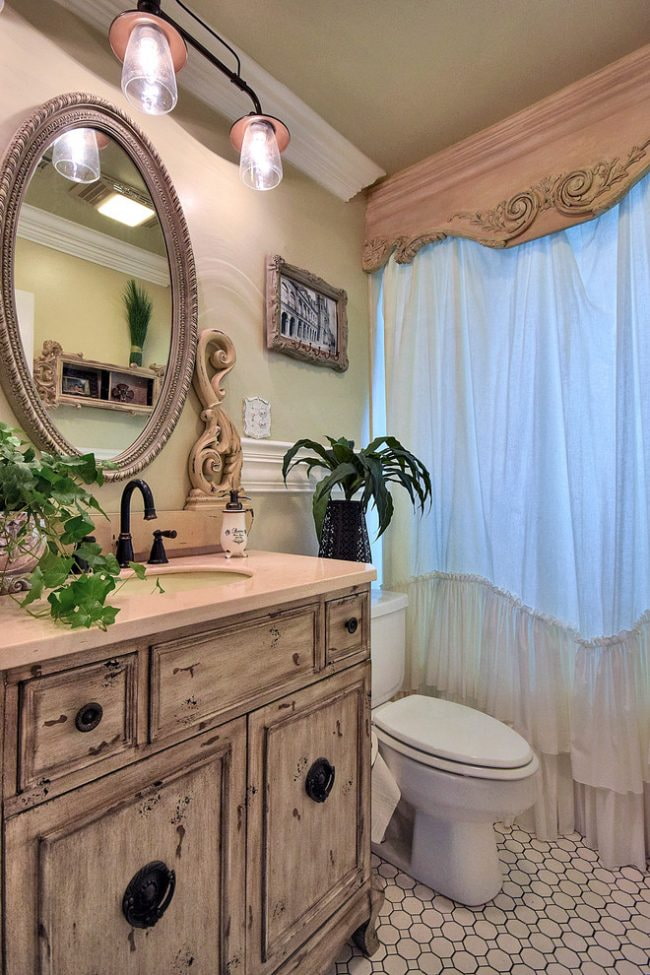 The Provence style bathroom design features accessories that enhance the aesthetics of the environment: colorful rugs, woven laundry baskets, linen curtains and pictures of nature. The interior is complemented by pots with plants, hanging planters with natural or dried flowers, forged hooks and towel holders.