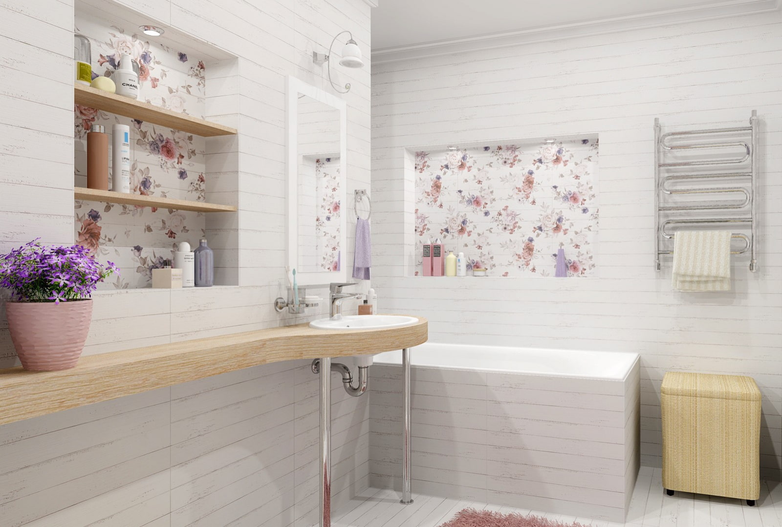 For cladding the walls of the Provence style bathroom, choose a square tile with a matte surface, since this direction does not accept shiny glazed tiles. A hog tile or decorative plaster with roughness and small cracks, through which brick or masonry is slightly visible, is also appropriate.