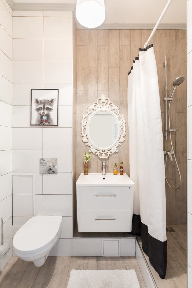 The mirror canvas above the countertop will perfectly reflect the stylistic orientation, create spatial illusions, focus on interior proportions and simply give the bathroom a special charm.