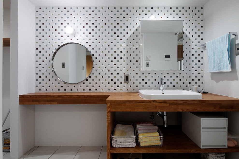 Pictured is a Scandinavian-style bathroom with a small round mirror in a wooden frame on the wall.