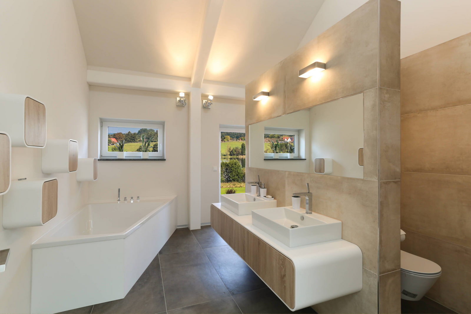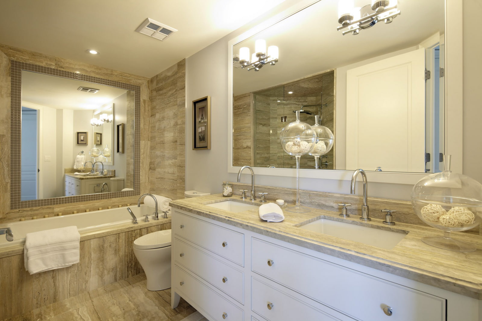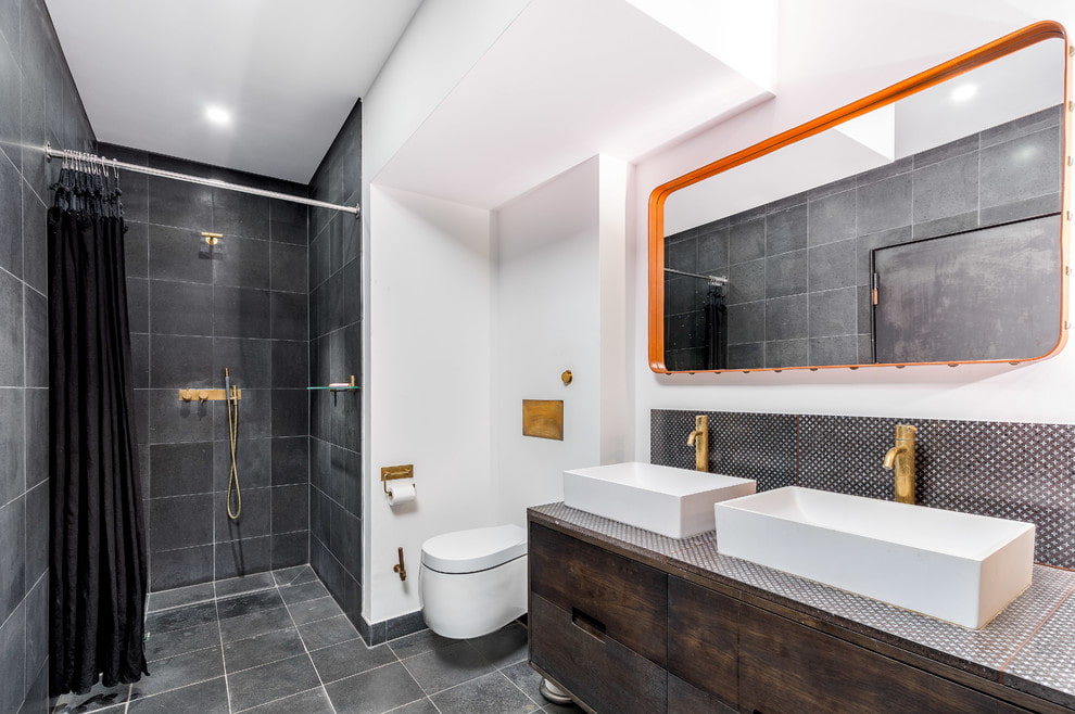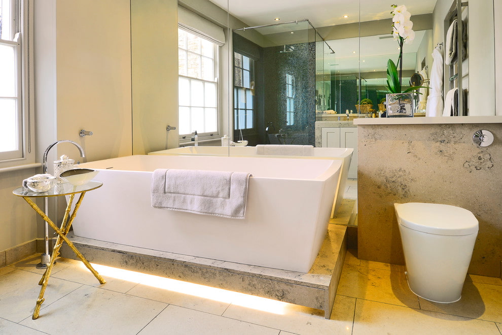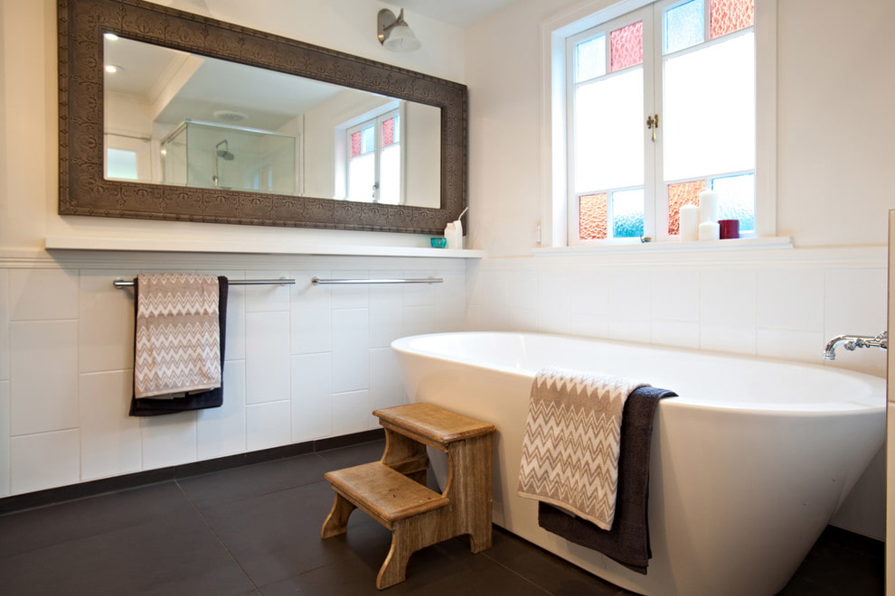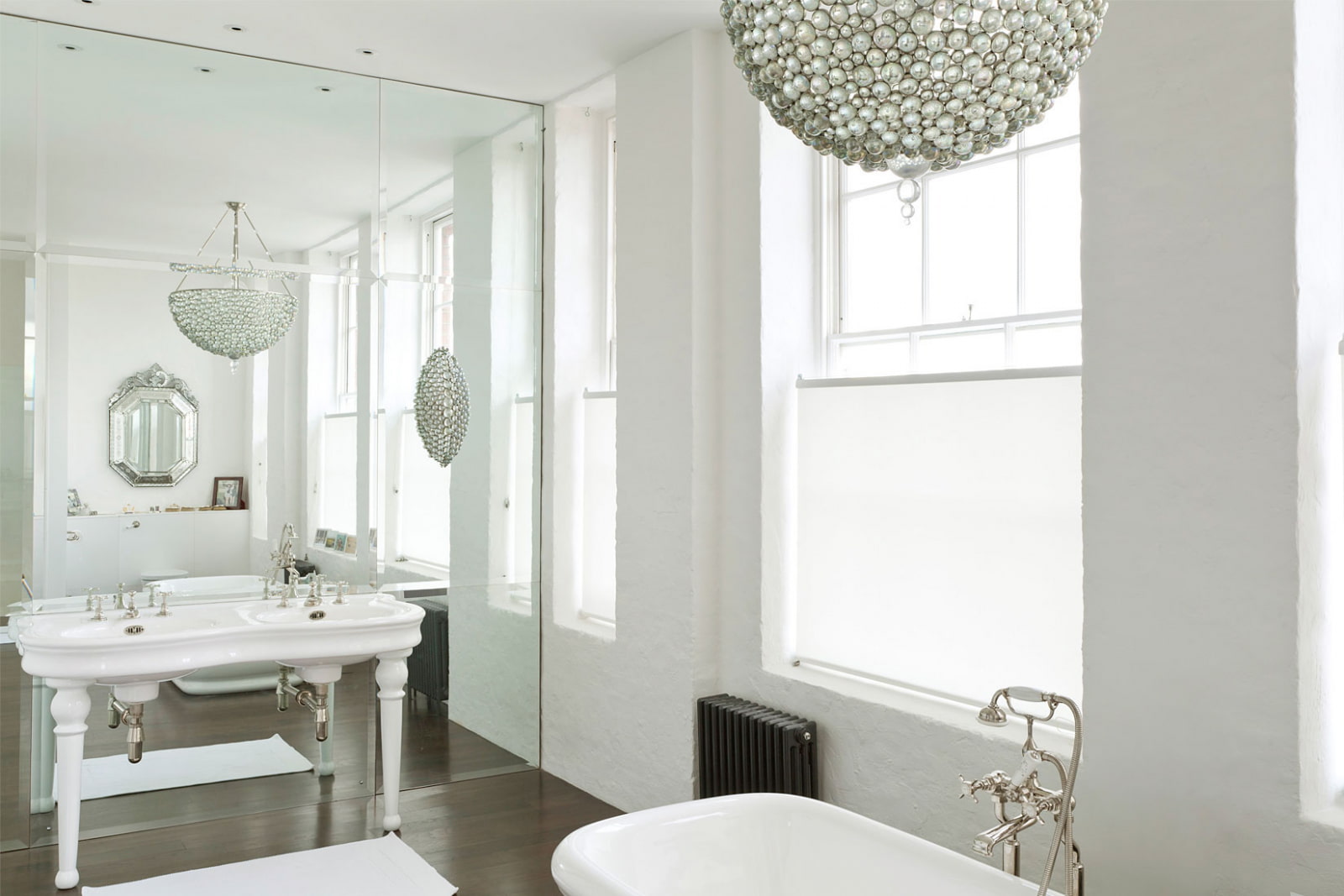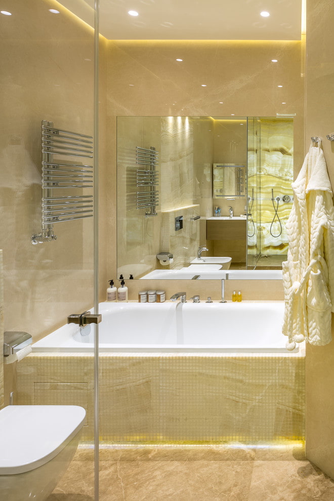 Mirrors located above the bathroom must be moisture resistant and treated with special compounds. This design looks very impressive and adds additional volume to the space.