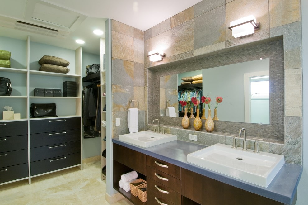 A rectangular or square mirror canvas of a more impressive size, located along the entire length of the wall or countertop with a washbasin, will be appropriate here.