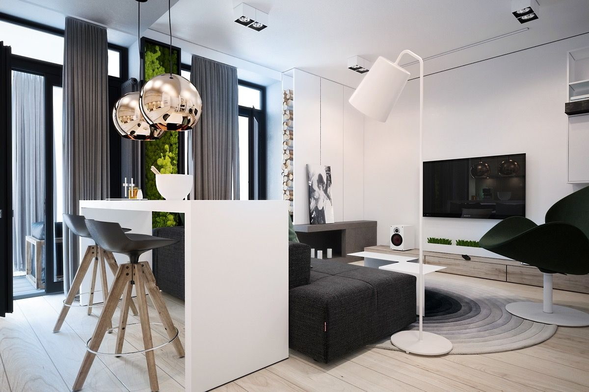 Also, to delimit the studio, wall cladding of different colors or textures, a bar counter, a rack and other functional pieces of furniture are perfect.