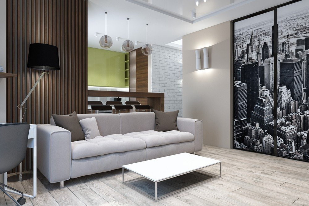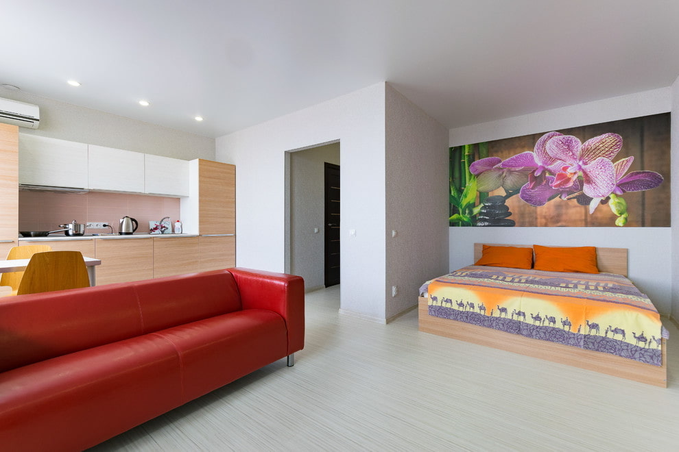 The studio is equated to one-room apartments with a free layout, in which there is no partition between the kitchen and the living room. Floor covering is sometimes used as zoning, for example, in the kitchen area, more practical and moisture-resistant materials are used, and the rest of the room is decorated with soft carpet.