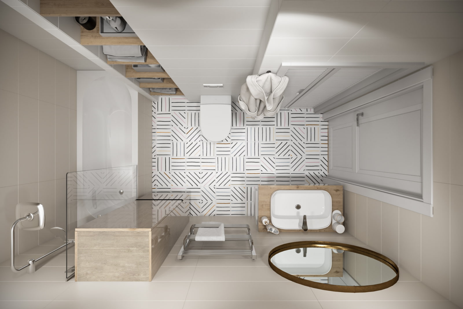 In the photo, a top view of the layout of a small combined bathroom in the interior of an apartment of 45 sq.
