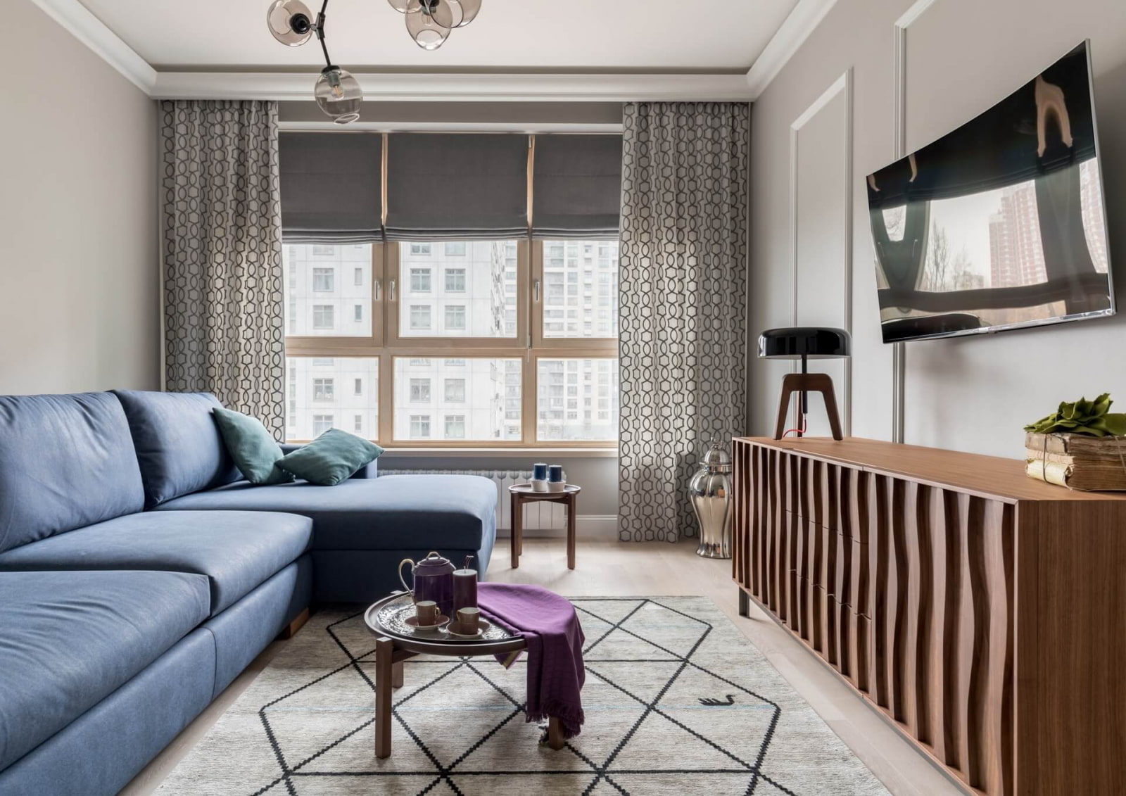 The photo shows the design of the living room in a modern style, in a two-room apartment of 45 squares.