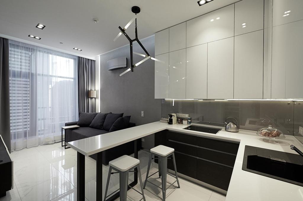In the photo there is a combined kitchen-living room in light colors in the interior of a 45 sq. m.