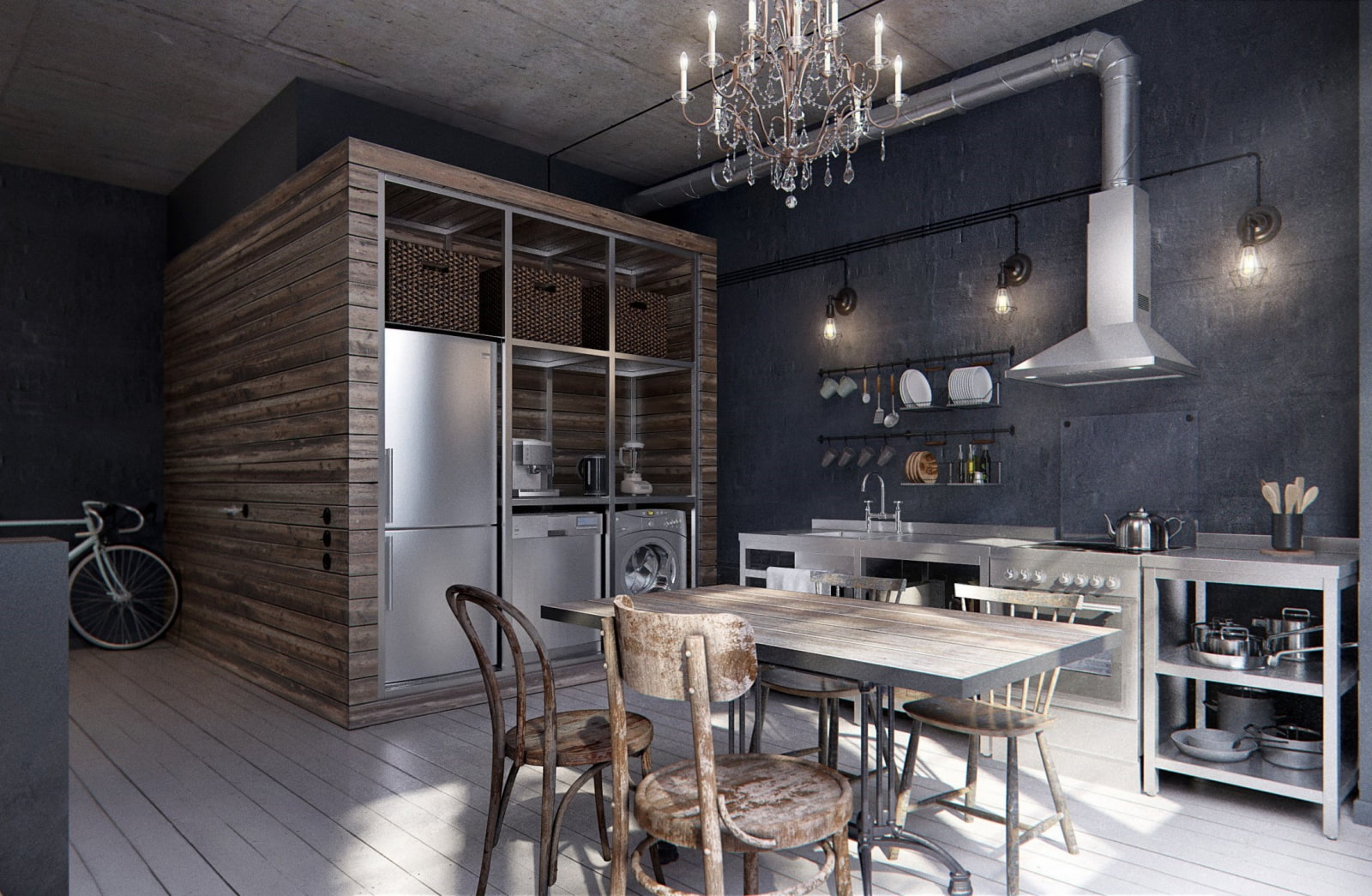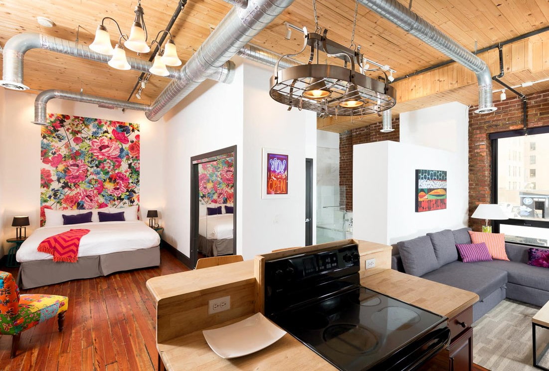 This design is characterized by the use of unusual items and non-standard furniture, for example, chests or suitcases are chosen as a place to store things. In a loft studio, the aesthetic contrast of modern technology and vintage furniture is especially appropriate against the background of raw brick walls.