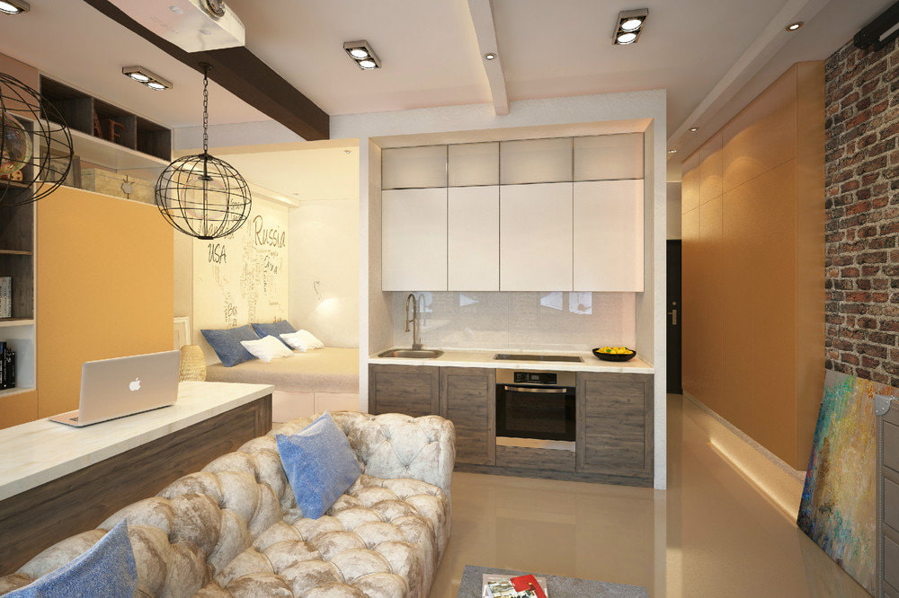 In the center of the guest area, you can place a large sofa with velvet or leather upholstery and complement it with a wooden coffee table, install a metal or wooden bed with a wardrobe in the bedroom, and choose a mobile island or a functional and organic set with built-in appliances for the kitchen space. saving square meters.