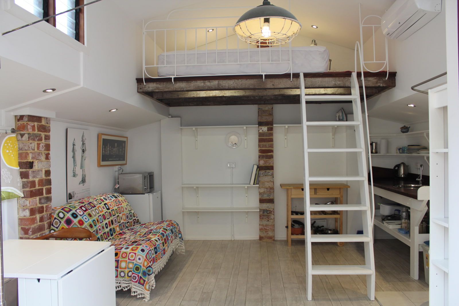 The photo shows the interior of a loft-style studio apartment with a large leather sofa located in the middle.