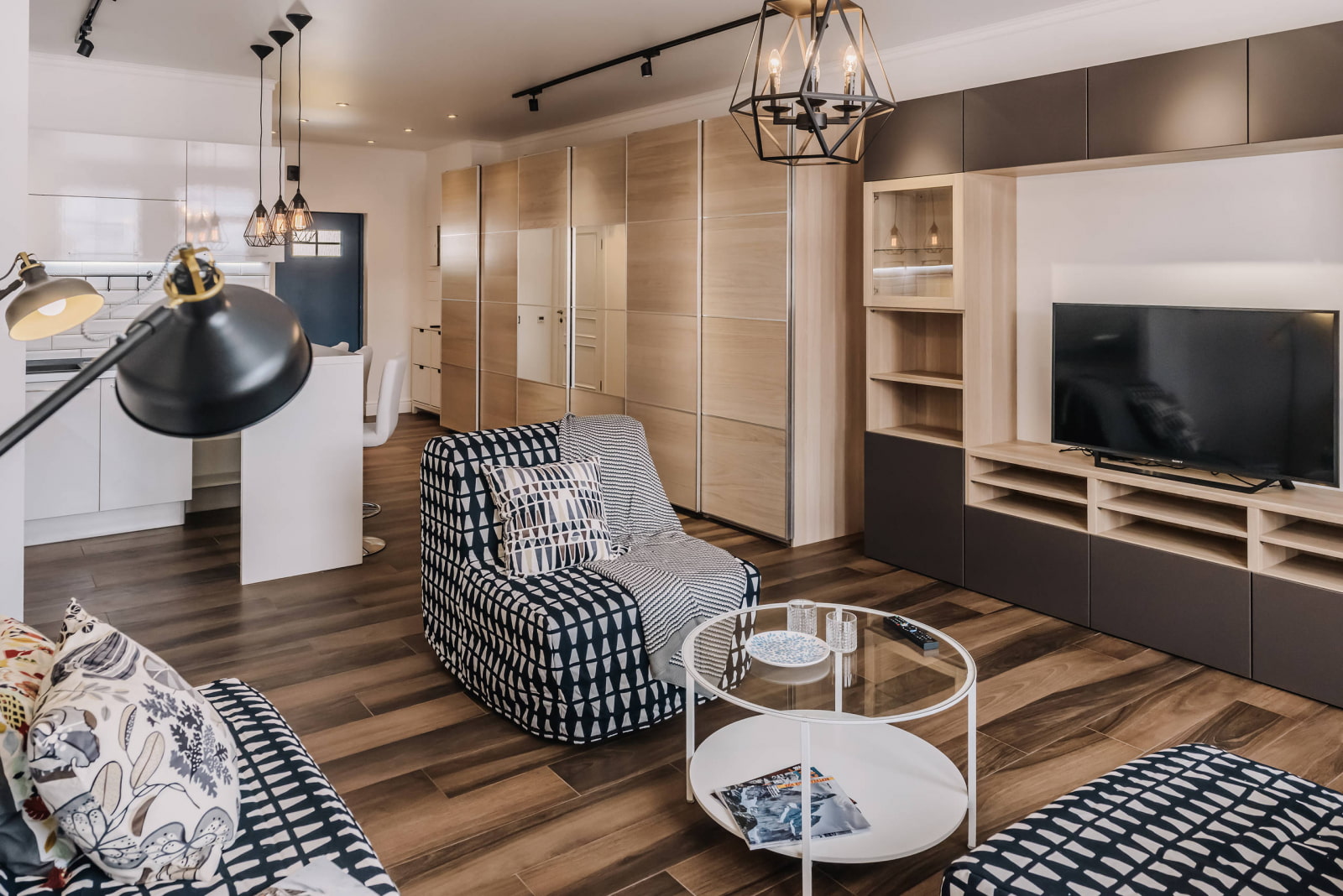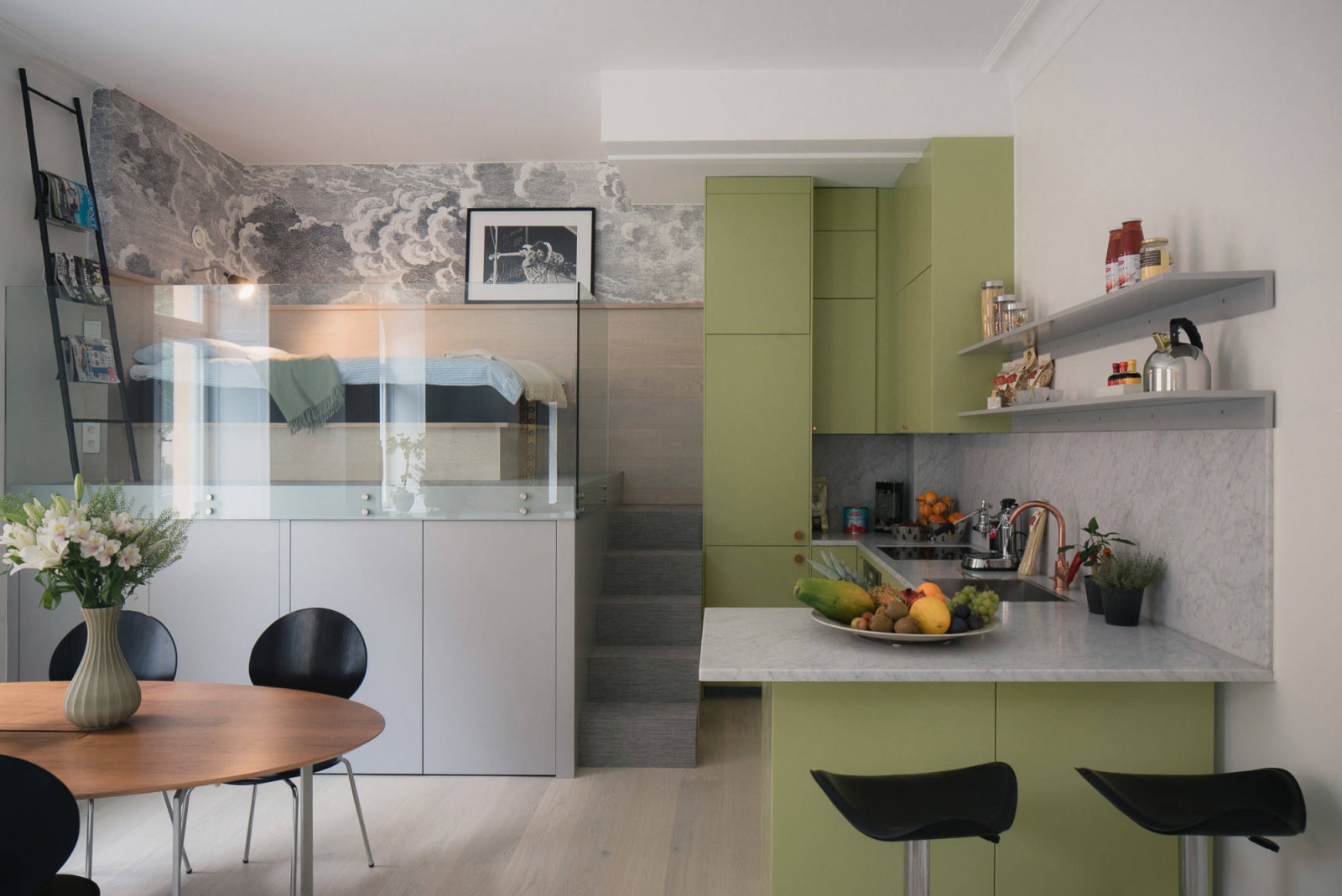 Initially, the studio apartment has no walls, except for those that separate the living area and the bathroom. Some owners still erect a partition, turning the house into a one-room apartment, as a result of which they get a modest kitchen and a small bedroom. This design is suitable for those who love privacy and are ready to sacrifice space for it.