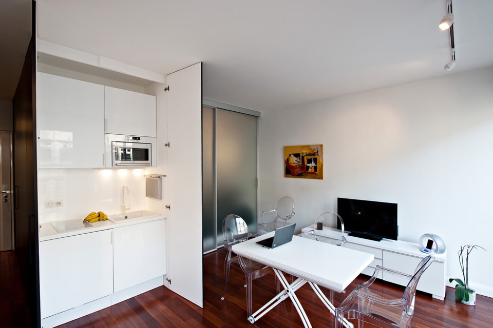 In the photo there is a kitchen set hidden in the closet: it is visible only during cooking. There is a bed hidden behind frosted glass compartment doors.
