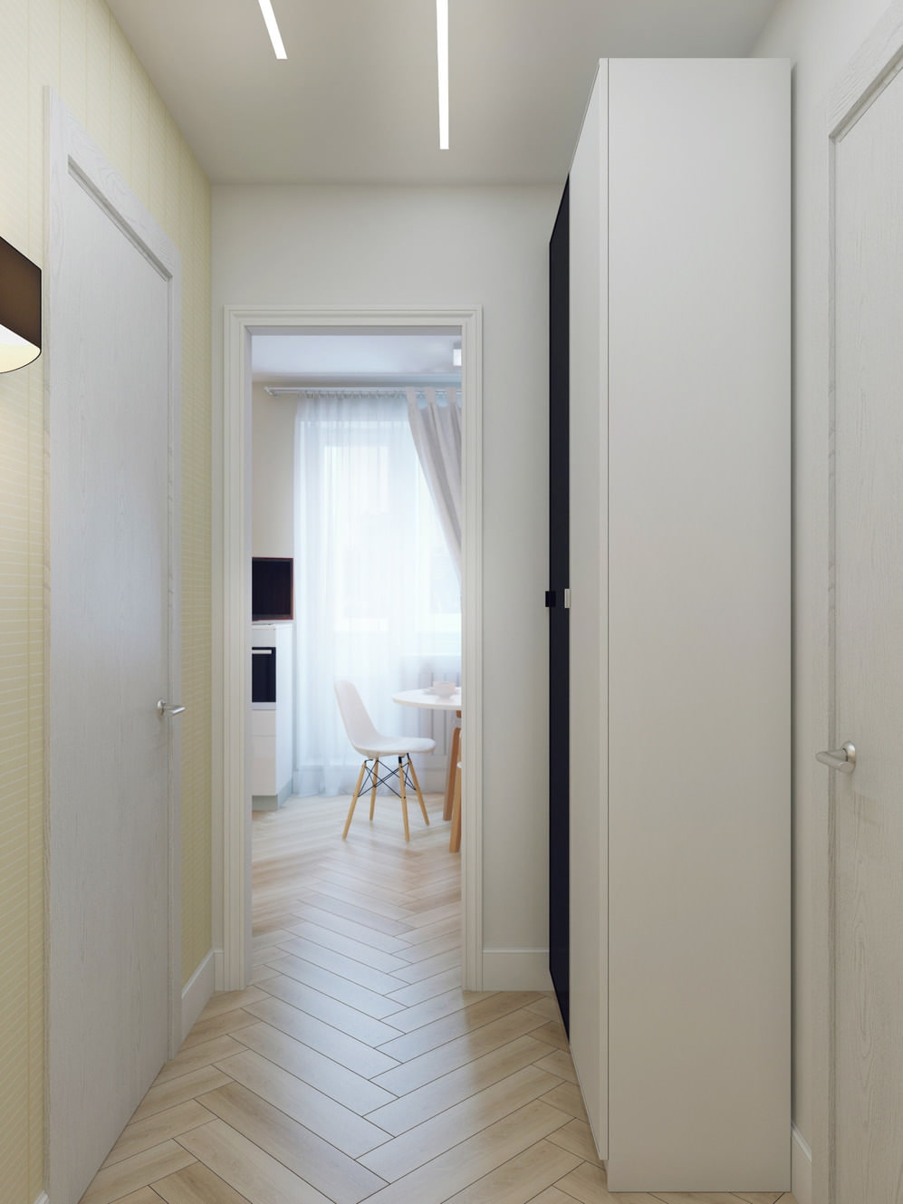 The entrance hall is illuminated by lightboxes fixed to the ceiling, as well as by two wall lamps by the mirror.