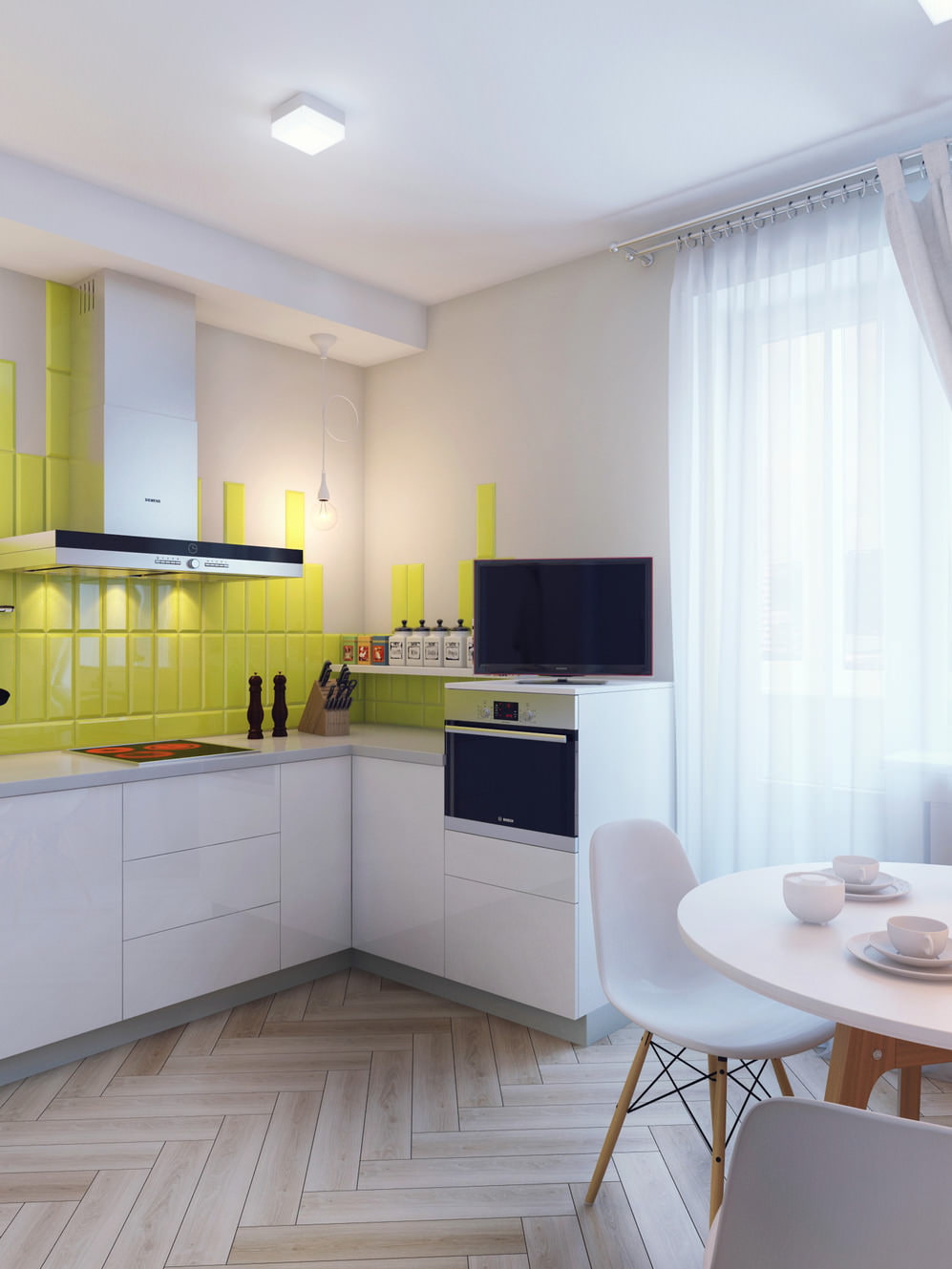 In the kitchen, in addition to the ceiling lamps in the shape of squares, the working area is highlighted with lamps hanging from the ceiling on long cords.