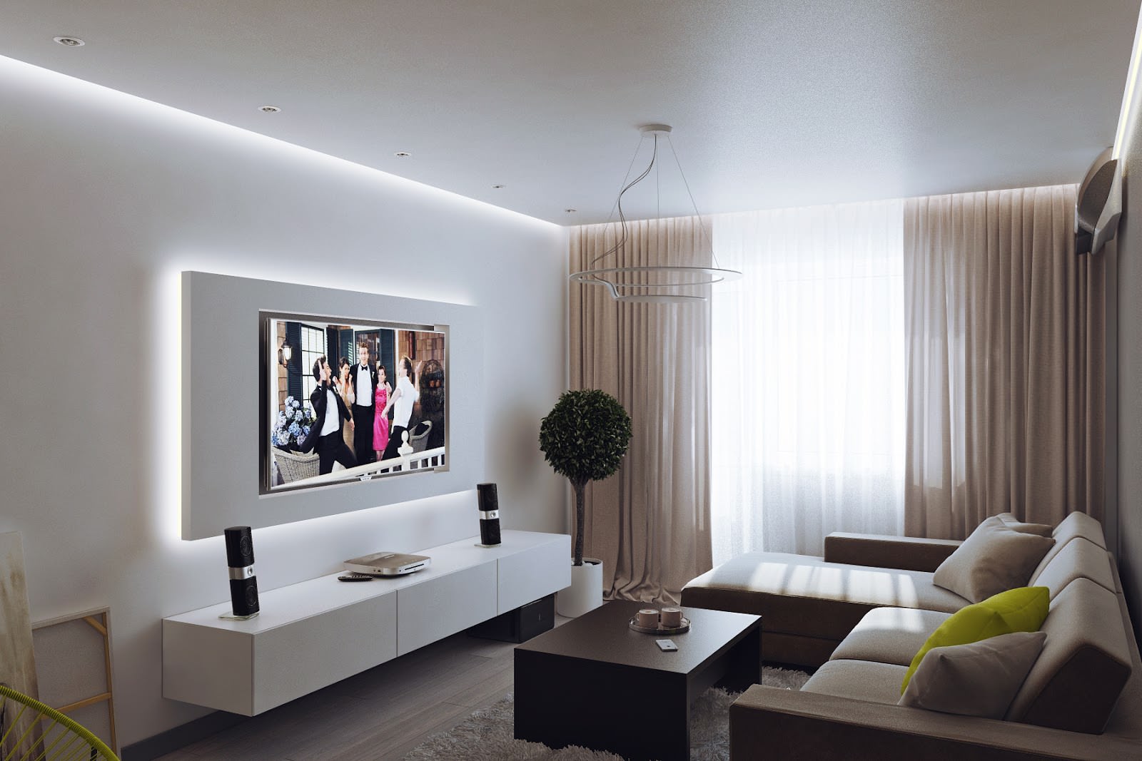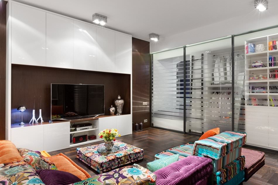 Particular attention is paid to the design of the hall, to the furnishings. Mandatory attributes in the living room interior are a sofa with armchairs or poufs, a coffee table and a TV. The cladding is dominated by light colors combined with bright interior elements such as pillows and other textiles. Window openings are decorated with lighter curtains, creating the feeling of panoramic glazing. A small carpet and houseplants will help to give the atmosphere maximum comfort.