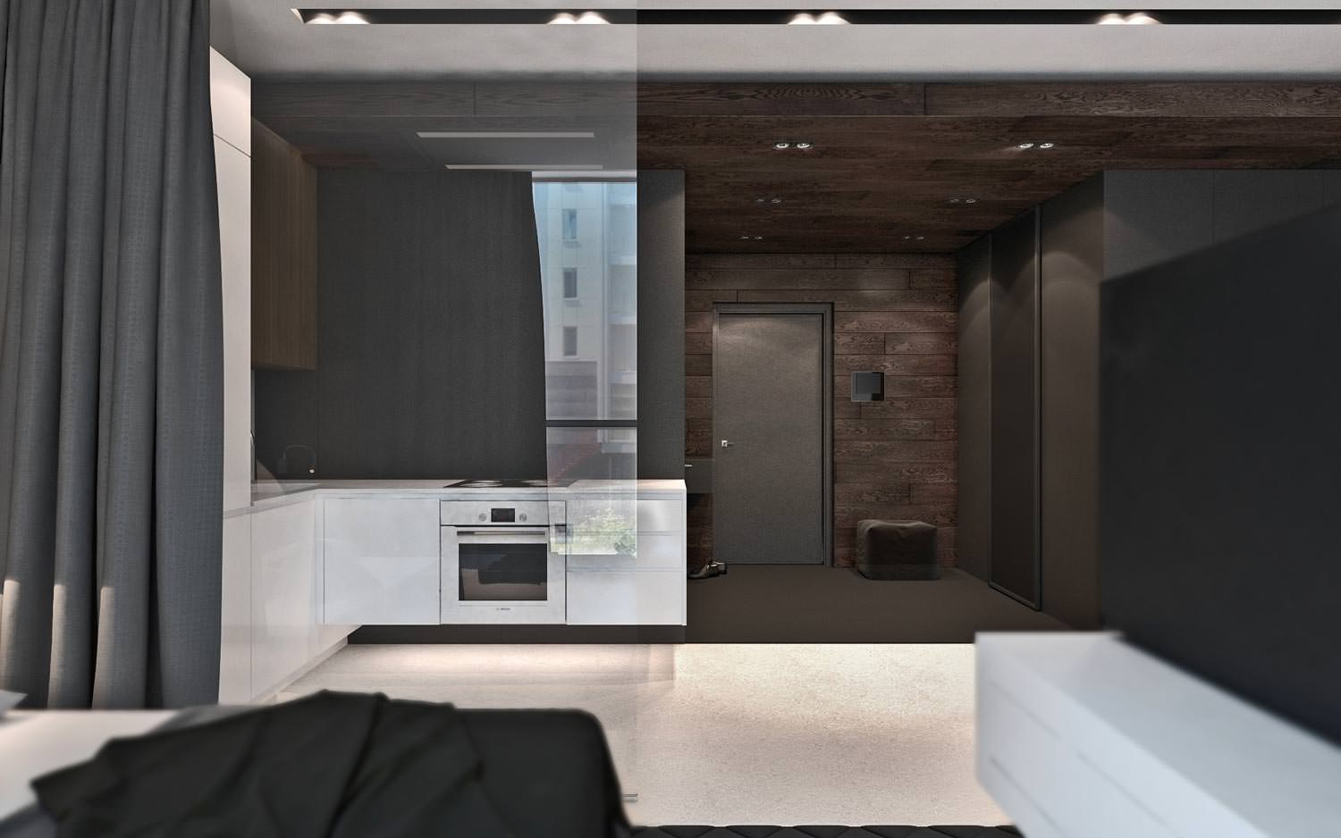 In the photo there is a design of a studio apartment of 50 sq., Made in high-tech style.