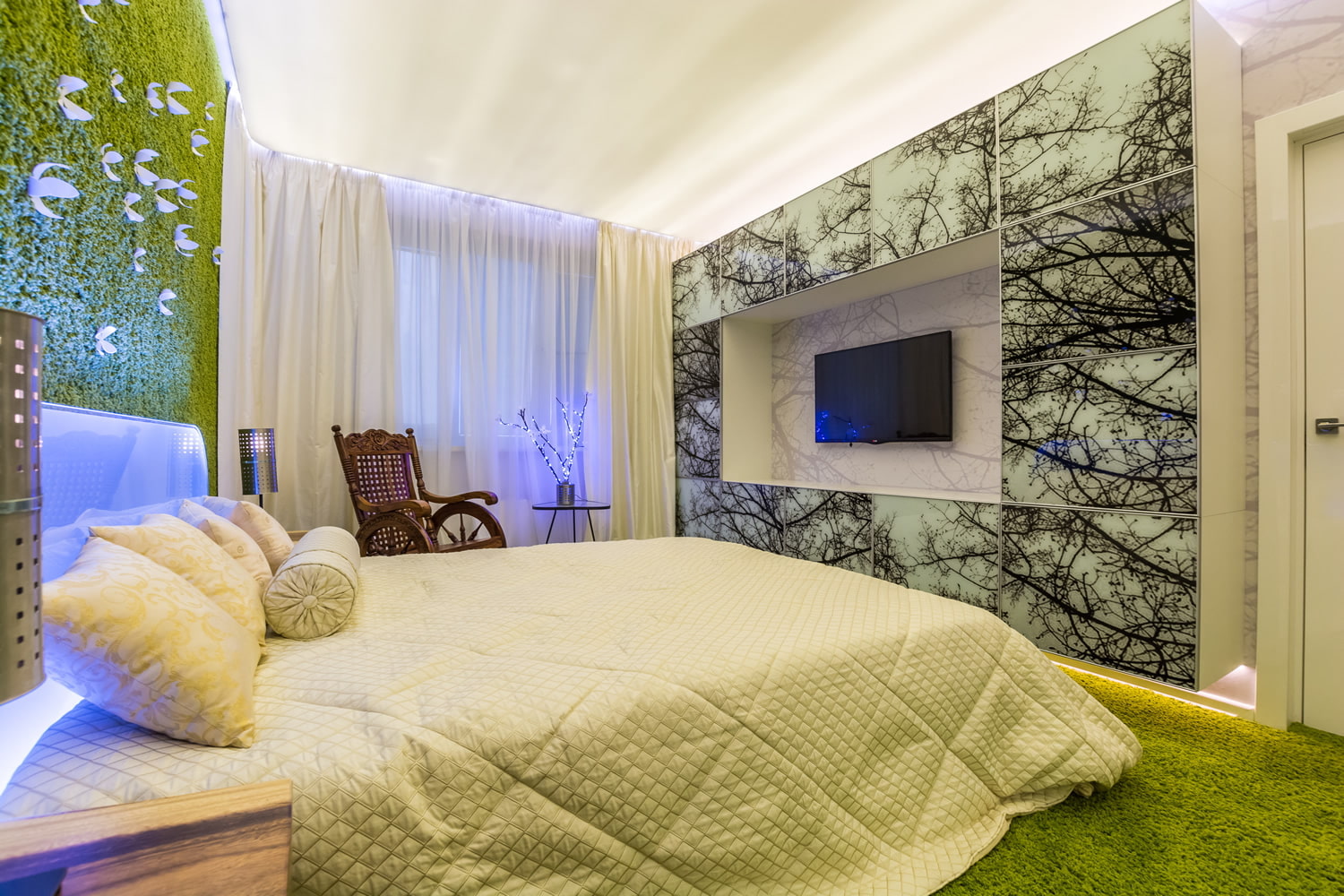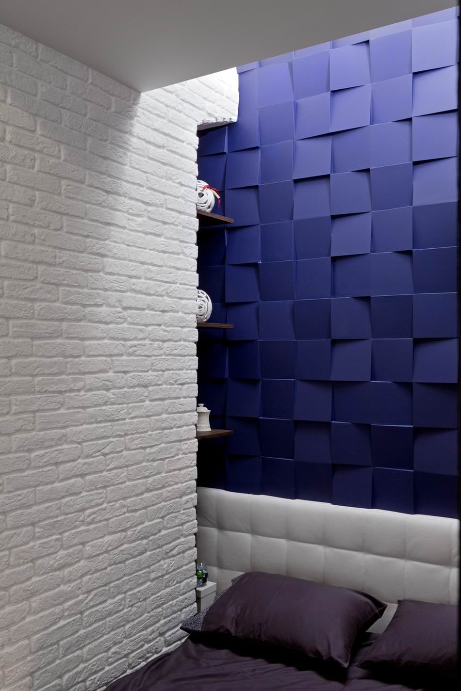 In such rooms, the bed generally has a classic arrangement with the headboard against one of the walls. To save space, lockers or open shelves are placed above the bed. When equipping a work area, it is better to choose a space near a window, due to the large amount of natural light.