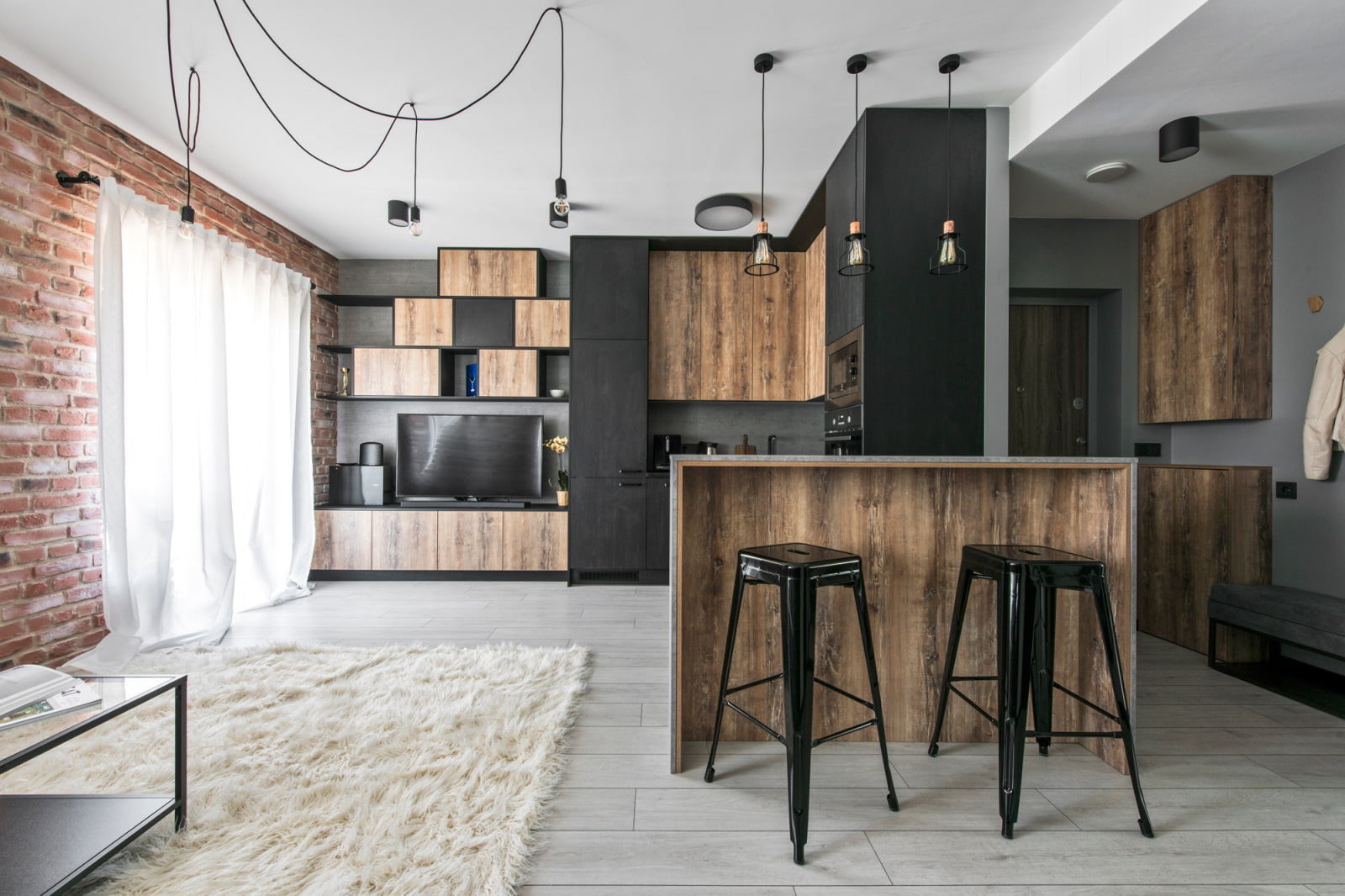 The photo shows the interior of a combined kitchen-living room in the design of an apartment of 50 squares in a loft style.