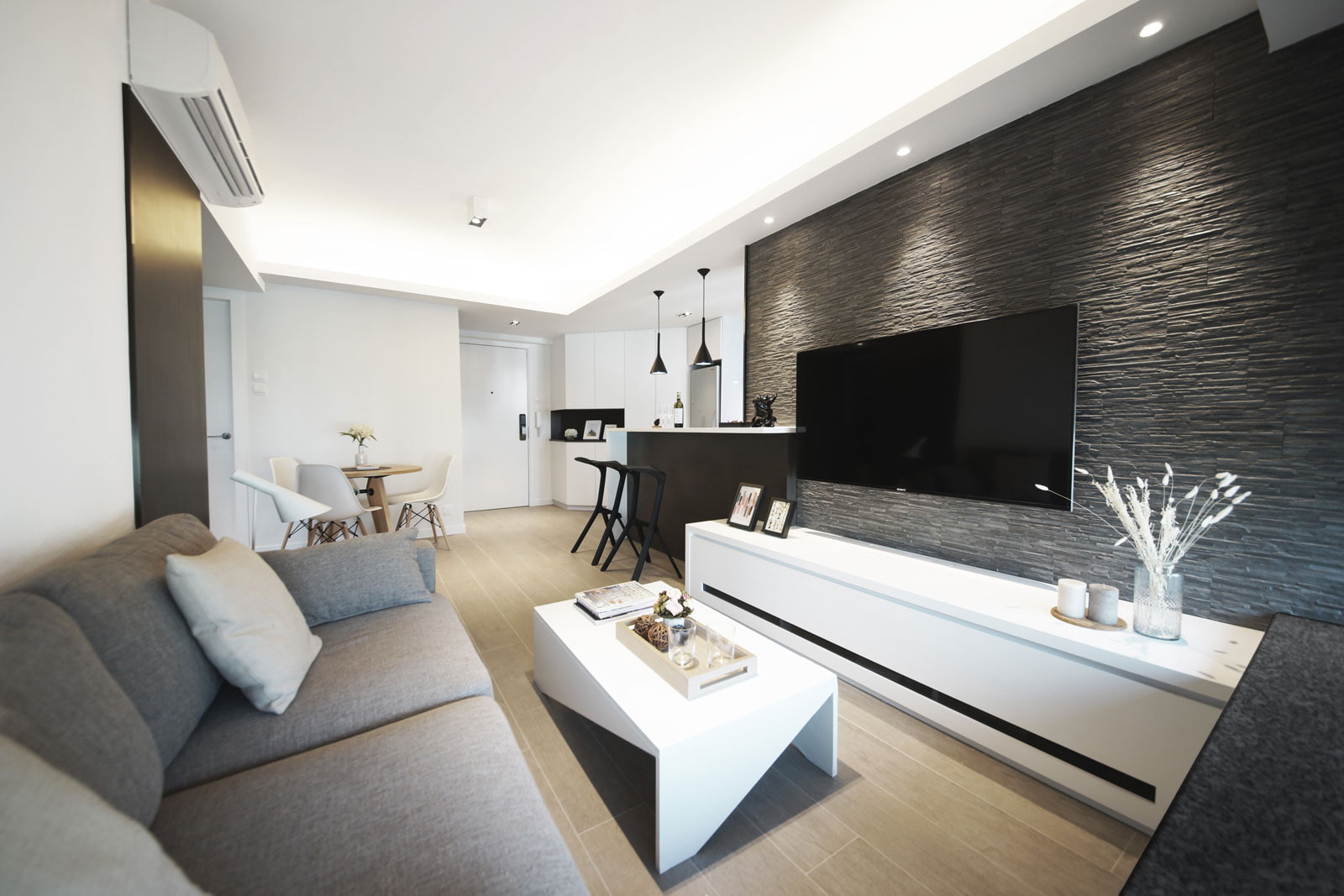 The photo shows the interior of the living room in the design of a two-room apartment of 50 sq. m.