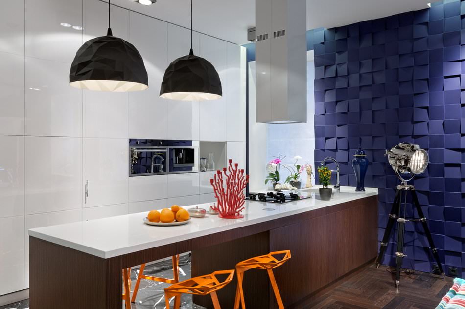 In the presence of a walk-through kitchen, it is important to correctly think over the intersection zones so that movement in the space is as comfortable as possible. The workplace in such a room, it is better to separate it with a dining table or bar counter.