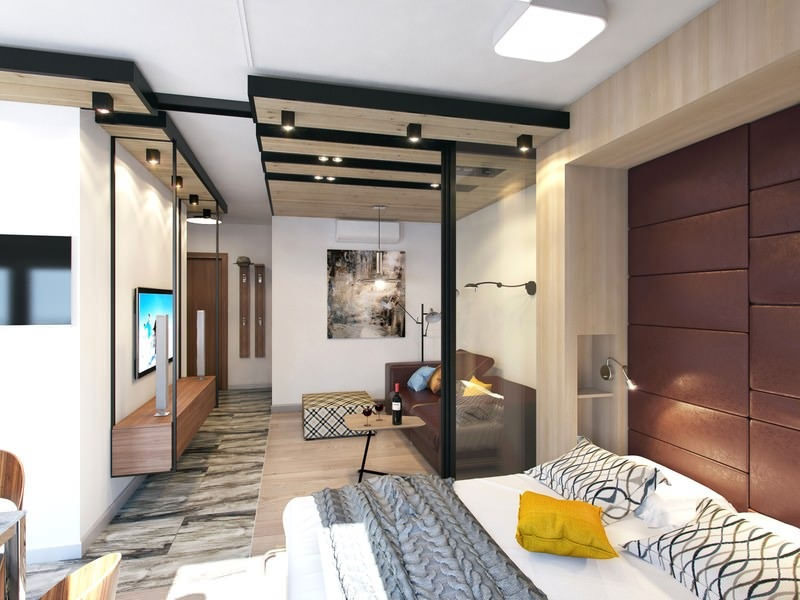 The interior design of a one-room apartment also takes into account the need to store various sports equipment, the possibility of arranging a guest berth, and, if necessary, change not only the mood in the house, but even its layout.
