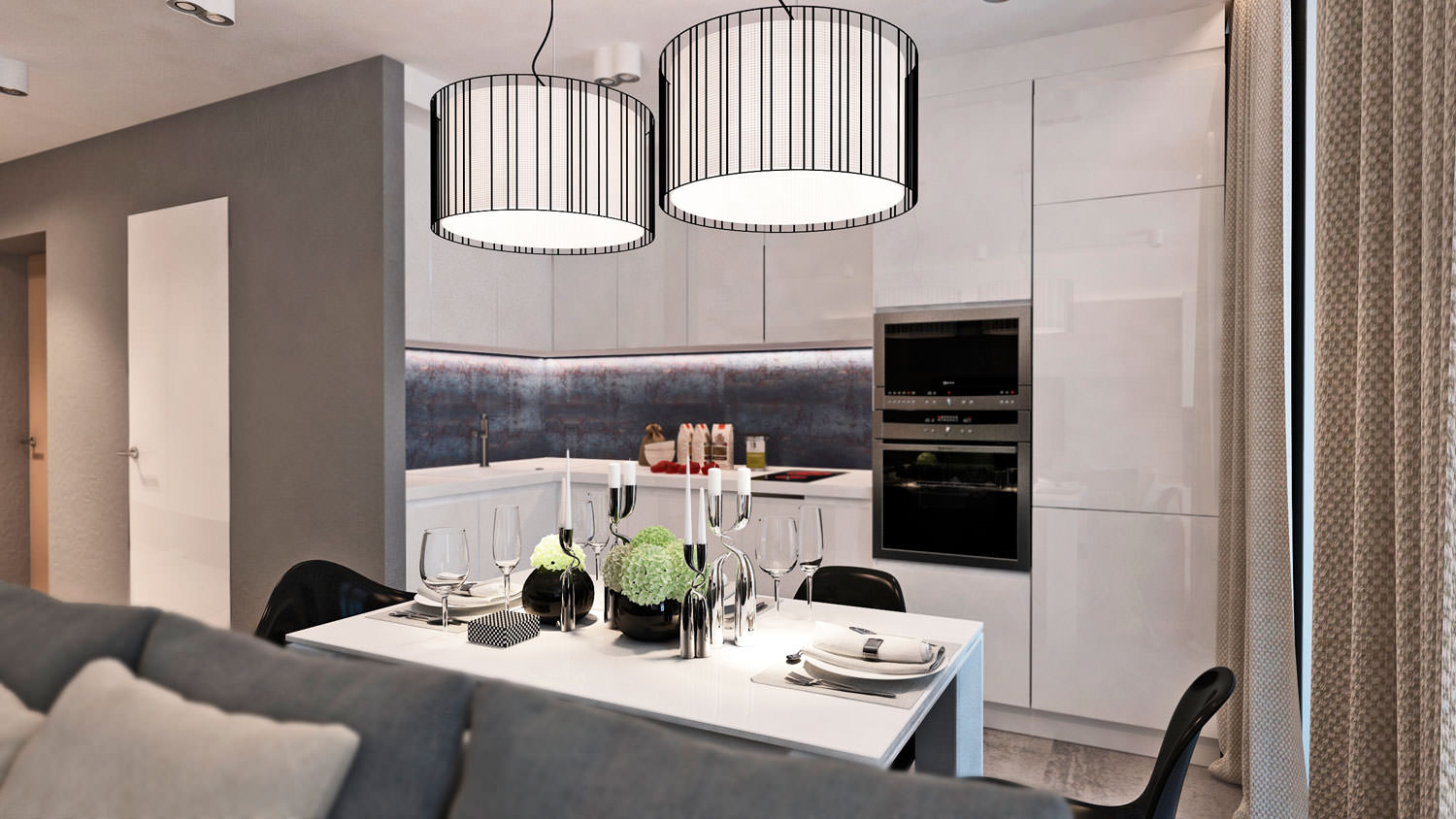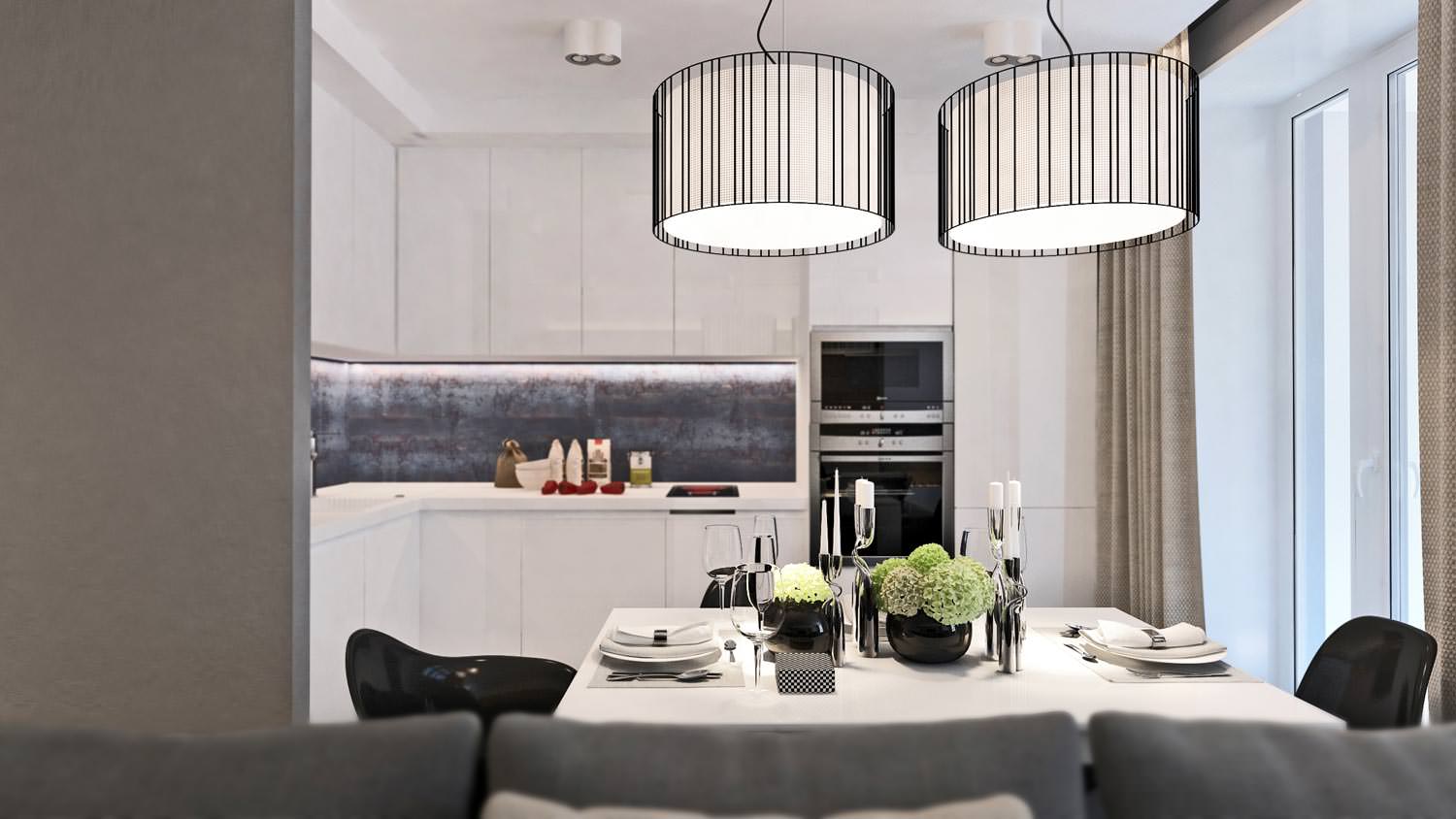 Corner set with white glossy facades contains a complete set of household appliances and storage systems. The dark finish of the backsplash and illumination of the work area give the kitchen a special appeal.