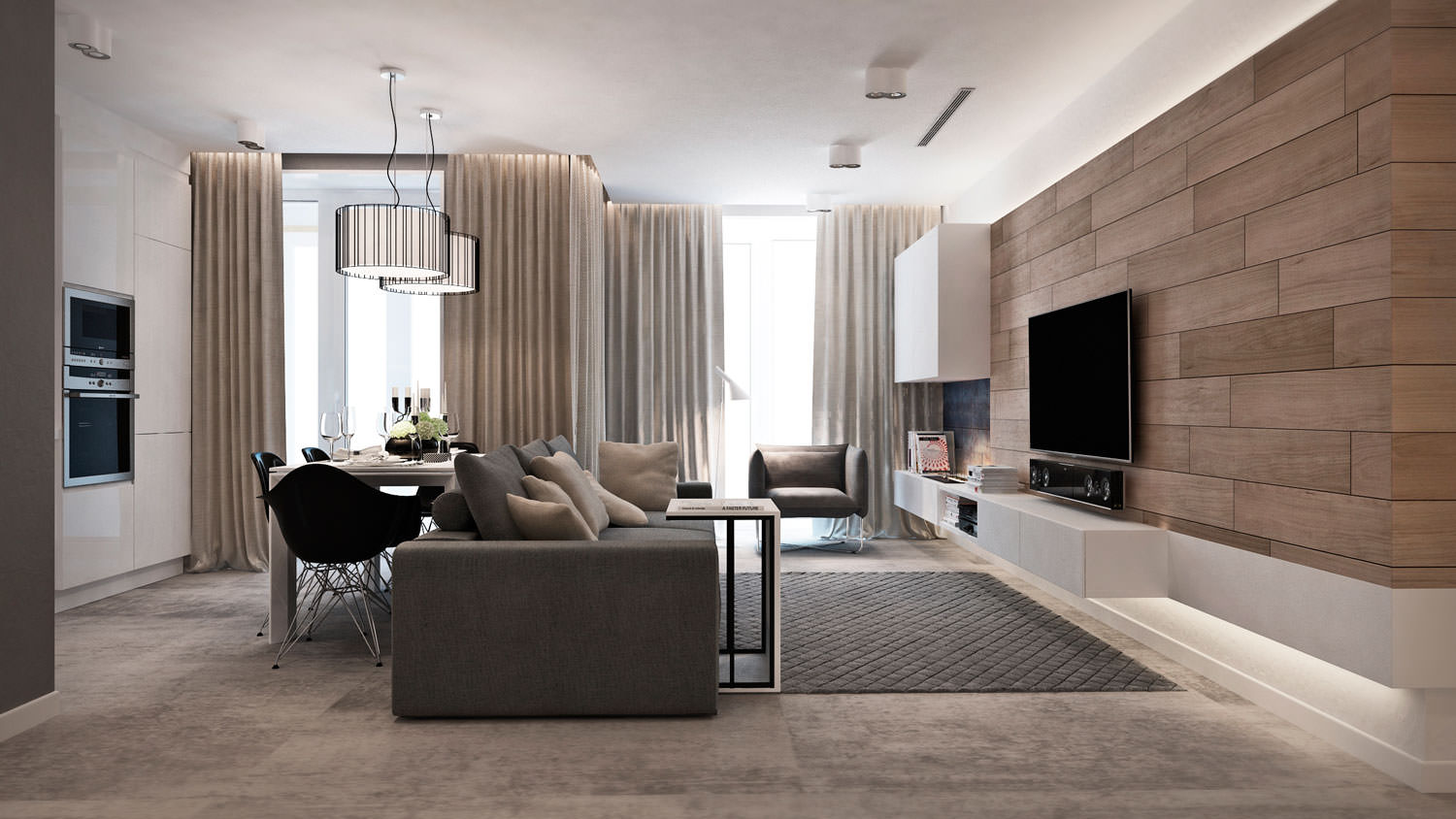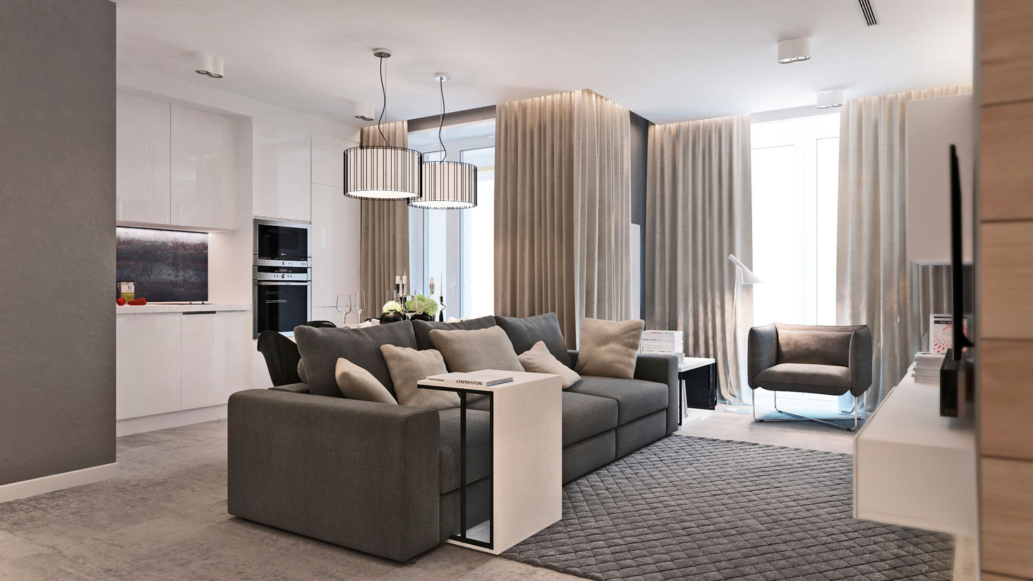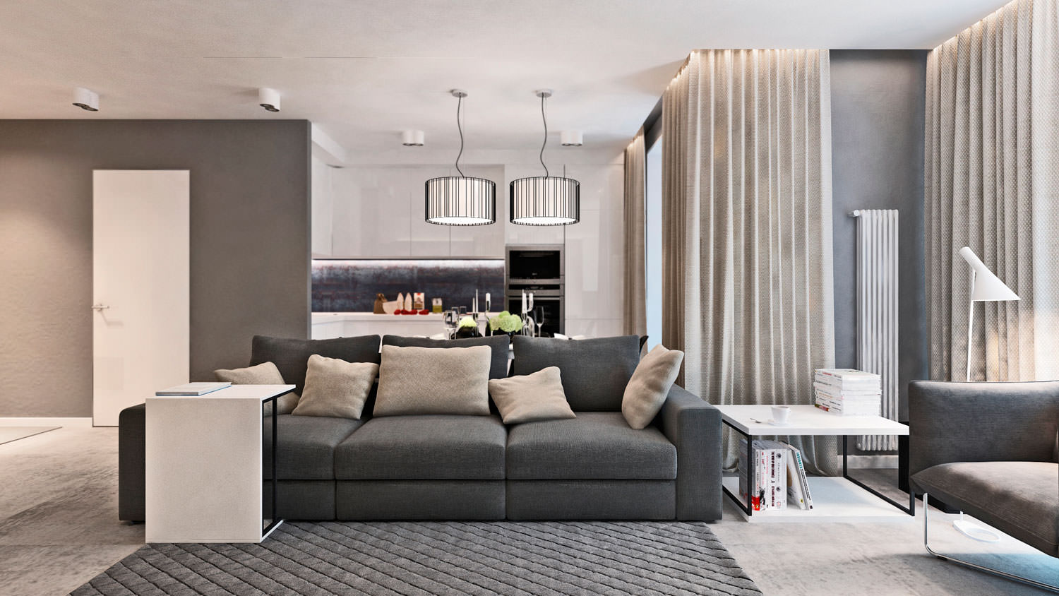 In the center of the room is a spacious dark gray sofa that separates the kitchen and living areas. It is complemented by two tables, simple in design, and one of them can be used as a workplace.