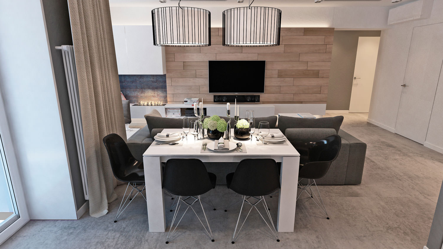Adjacent to the back of the sofa is a dining table with massive legs, surrounded by chairs in contrasting dark colors. Two hangers with large lampshades help create a cozy evening environment.