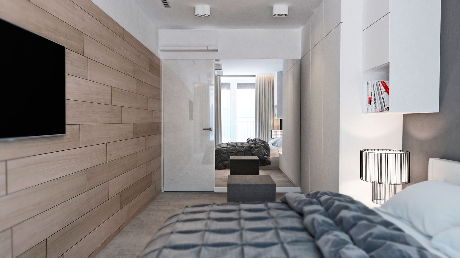 In the interior design of a three-room apartment, the bedroom is decorated similarly to the living room - wood-like panels, a combination of white and gray, drapery with dense fabric. Fitted wardrobes surround the head of the bed, replacing one of the bedside tables with reading lamps. A tall mirror allows you to choose the right outfit and visually enlarges the bedroom.