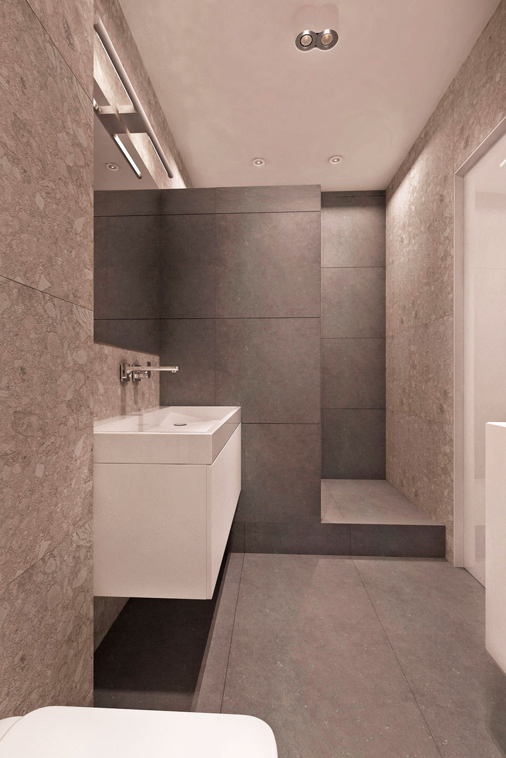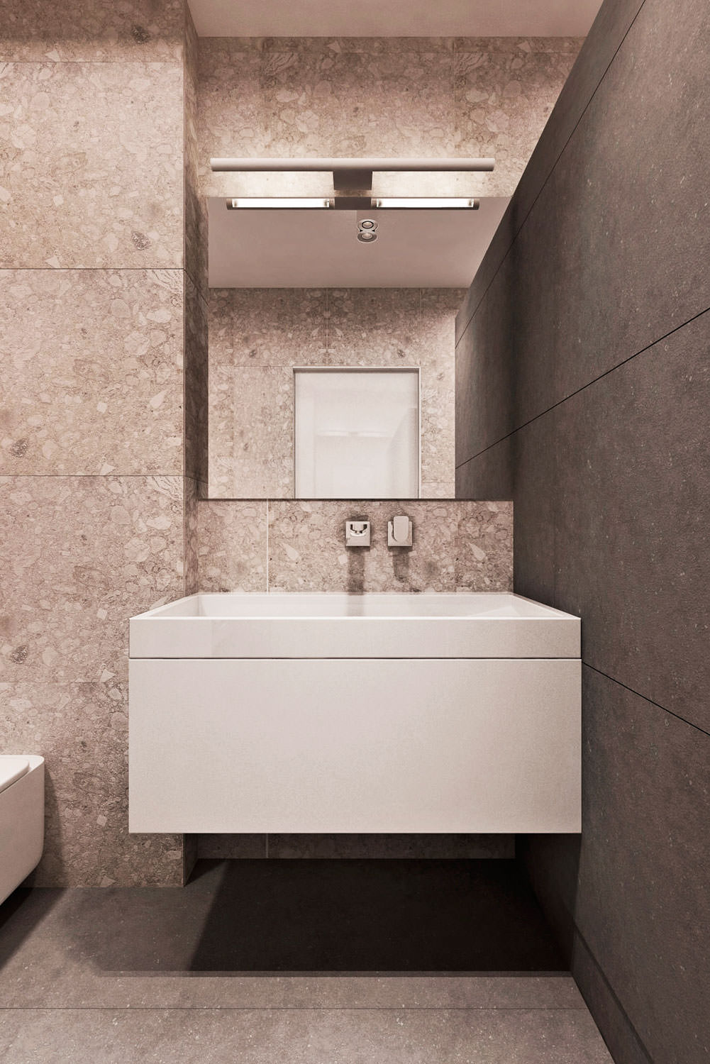 In the interior of a three-room apartment, tiles with a large stone texture with a slight shade of red were used for finishing the bathroom. There is nothing superfluous in the room, which corresponds to the chosen style and taste of the owners.
