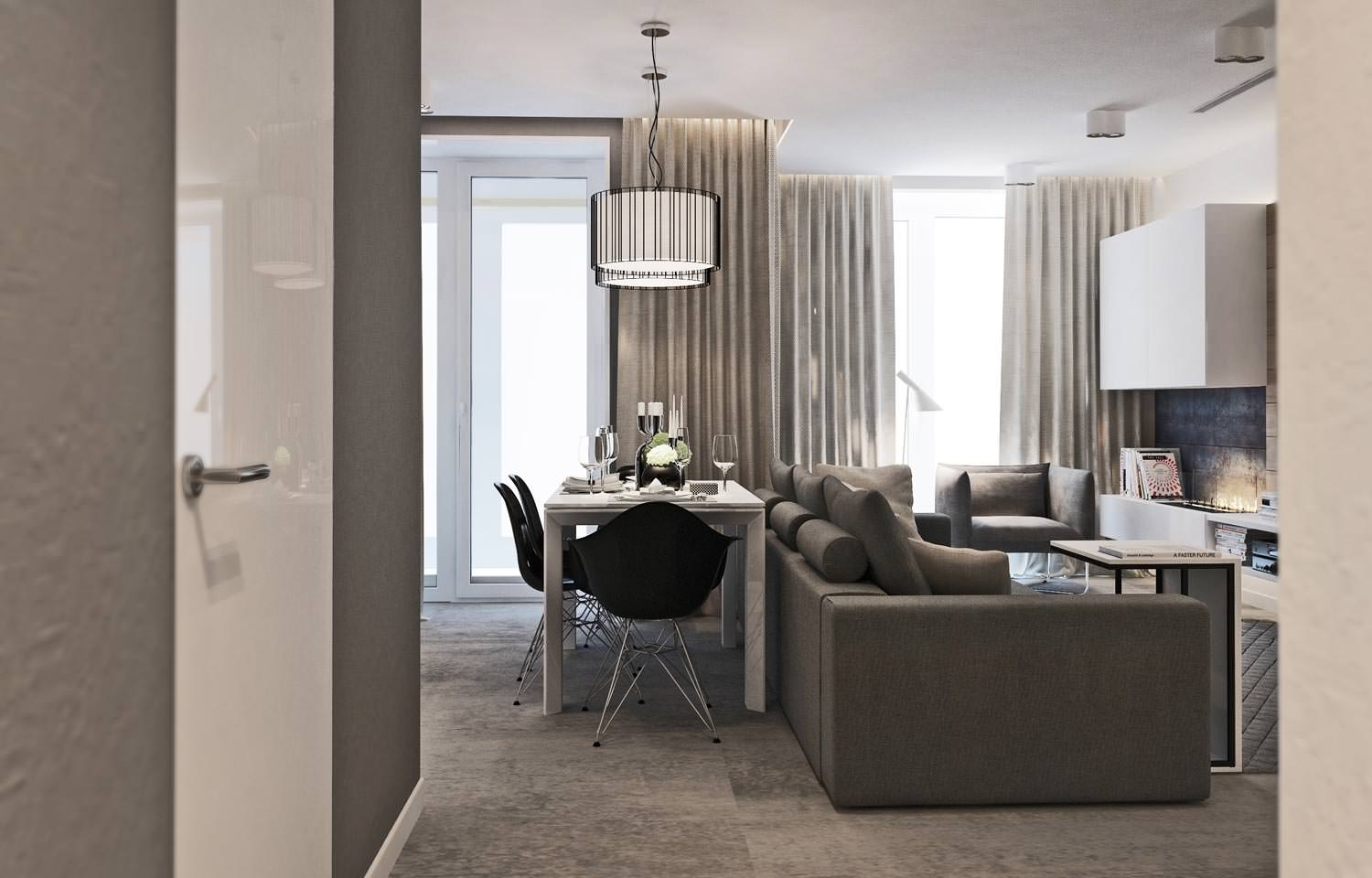 In a single space there is a kitchen, dining room and living room, and separate rooms are a bedroom and a nursery. The interior style of a three-room apartment with natural shades and strict lines corresponds to minimalism, a very popular trend in our time.