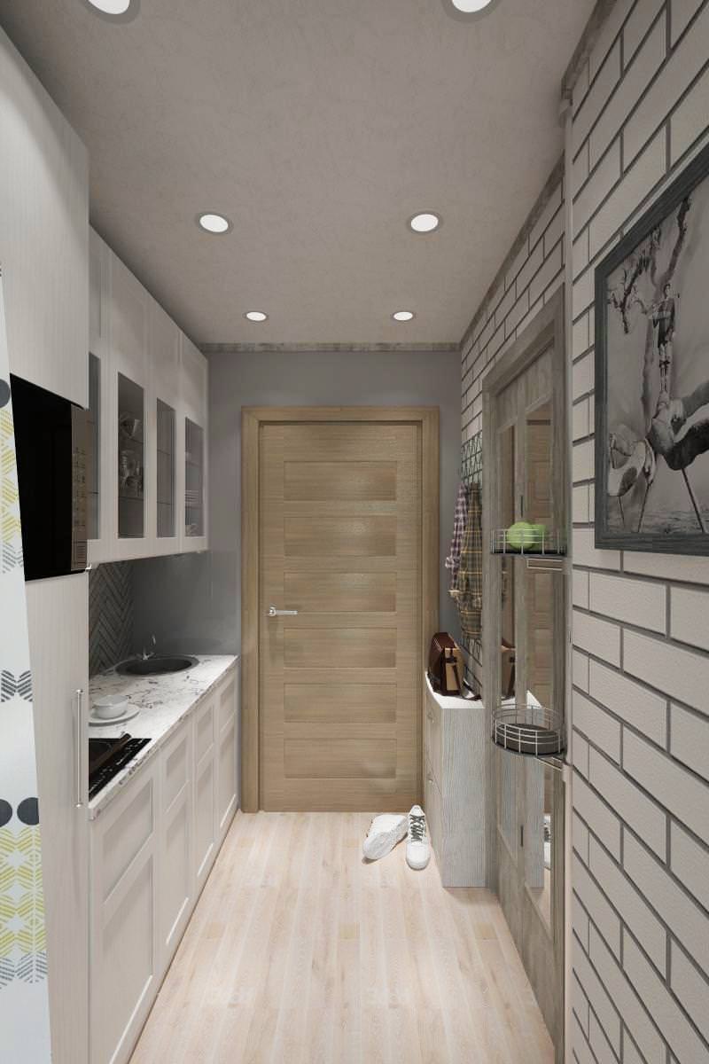 On the right, near the front door, there is an entrance hall equipped with a shoe rack and a small clothes hanger. Immediately - the front door leading to the bathroom. The kitchen area in the studio was placed directly next to the hallway, on the right. There is a sink, a two-burner electric stove, a refrigerator and a microwave oven.