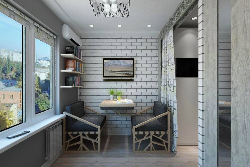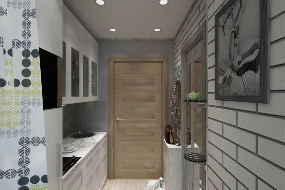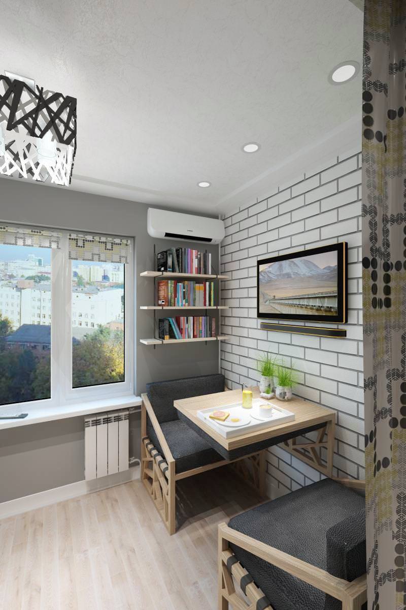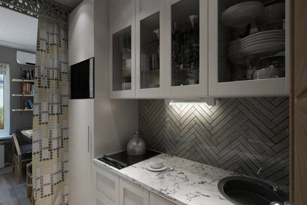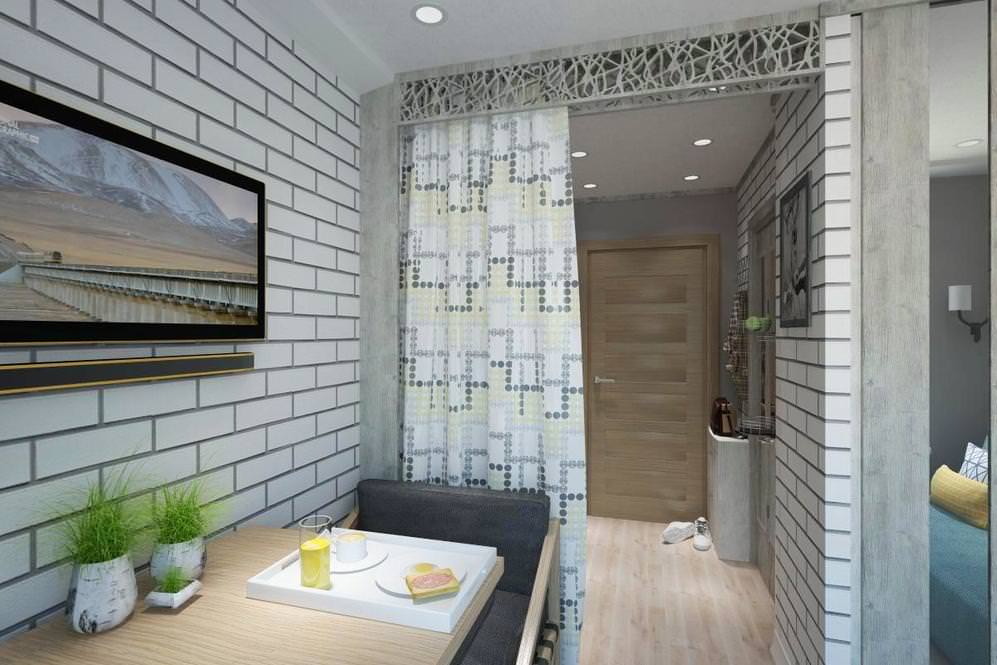 A tiny bathroom in an apartment of 14 sq. m. the designers have expanded, adding to it a part of the former corridor. The wall between the corridor and the room was removed as it interfered with the placement of kitchen equipment. There used to be a door in this wall, but there is no room to open it in the new studio layout. In order that, if desired, it was possible to separate the entrance area from the living area in the design of an apartment of 14 sq. m. a curtain-partition is provided. It fulfills both a functional and a decorative role, giving the interior warmth and coziness.