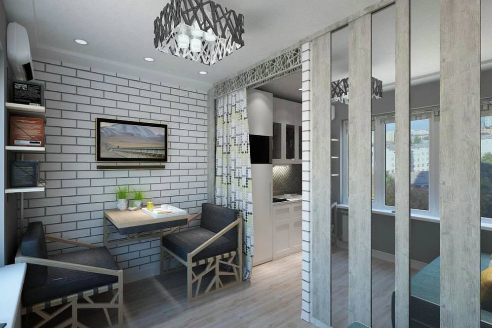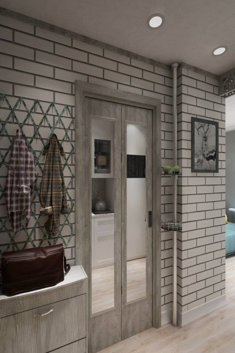 Ceiling in studio design 14 sq. m. is not quite ordinary: decorative plaster is applied to it, slightly "aged" and as if "shabby". It echoes the brickwork of the walls, harmonizing the look of the room. Decorative plastic cornices are reinforced along the entire perimeter. The entrance area and the living space of the room are separated by a decorative plywood grill with a pattern carved on it. The pattern was created using a laser.
