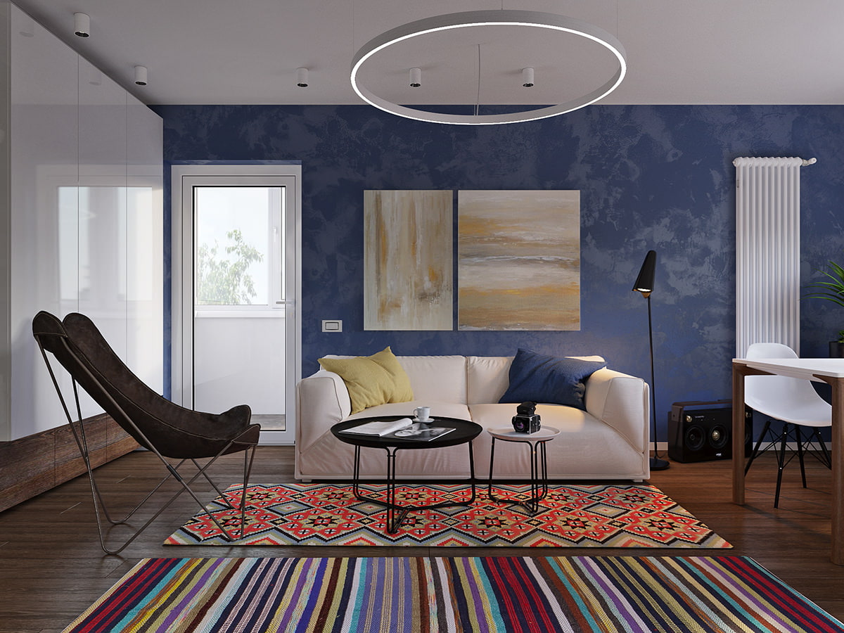 Color accents add brightness and dynamism to the interior of the studio - sofa cushions, patterned and striped carpets. In small-area apartments, minimalism is the most optimal style, and in this case it was chosen as the main one. The designers used colored textiles as decor.
