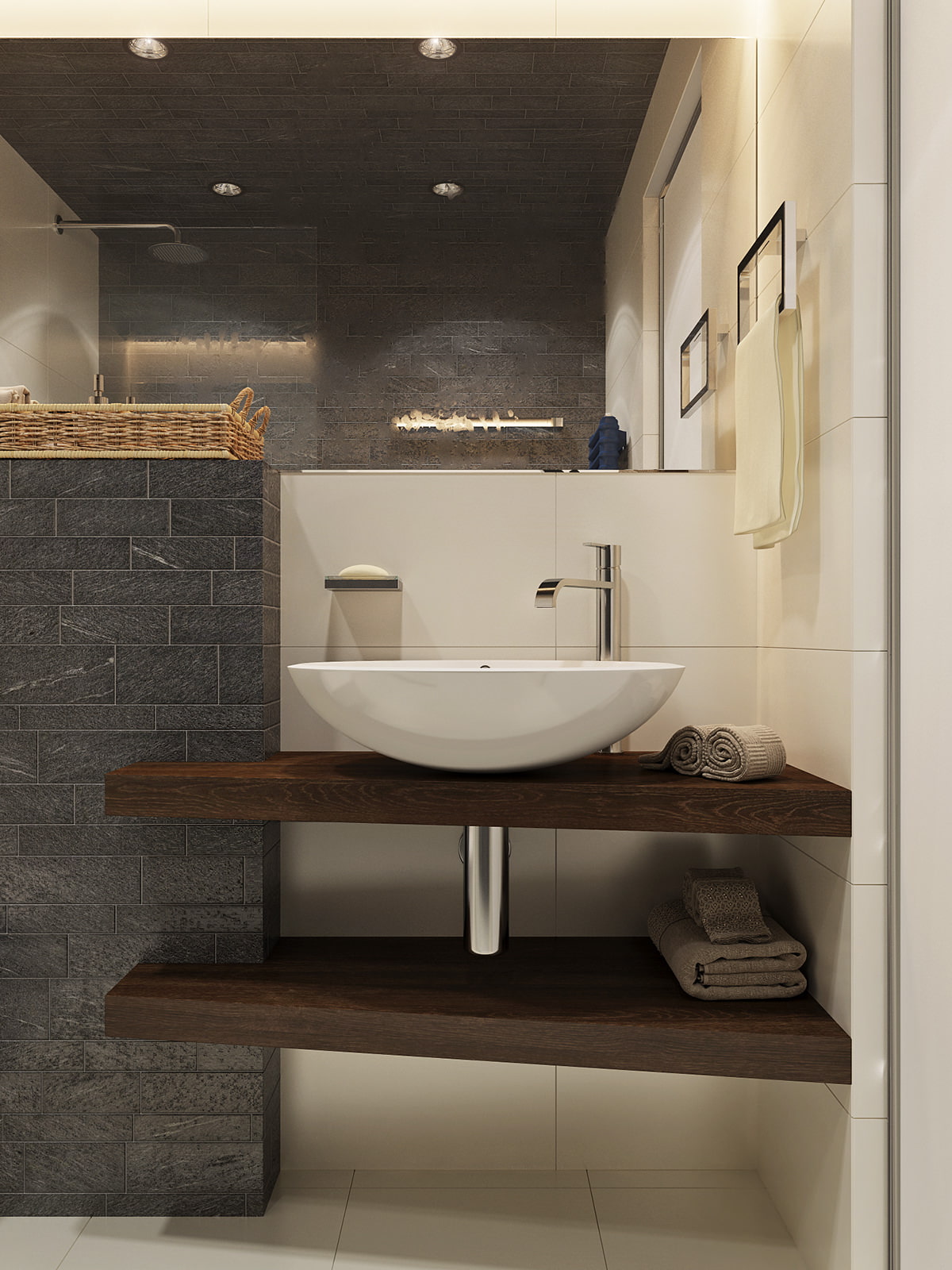 The design of the studio is 31 sq. m. The bathroom looks very impressive, the floor and part of the walls in it are lined with white smooth tiles of a large size, and the ceiling and walls in the "wet" zones - with black "bricks" of slate.