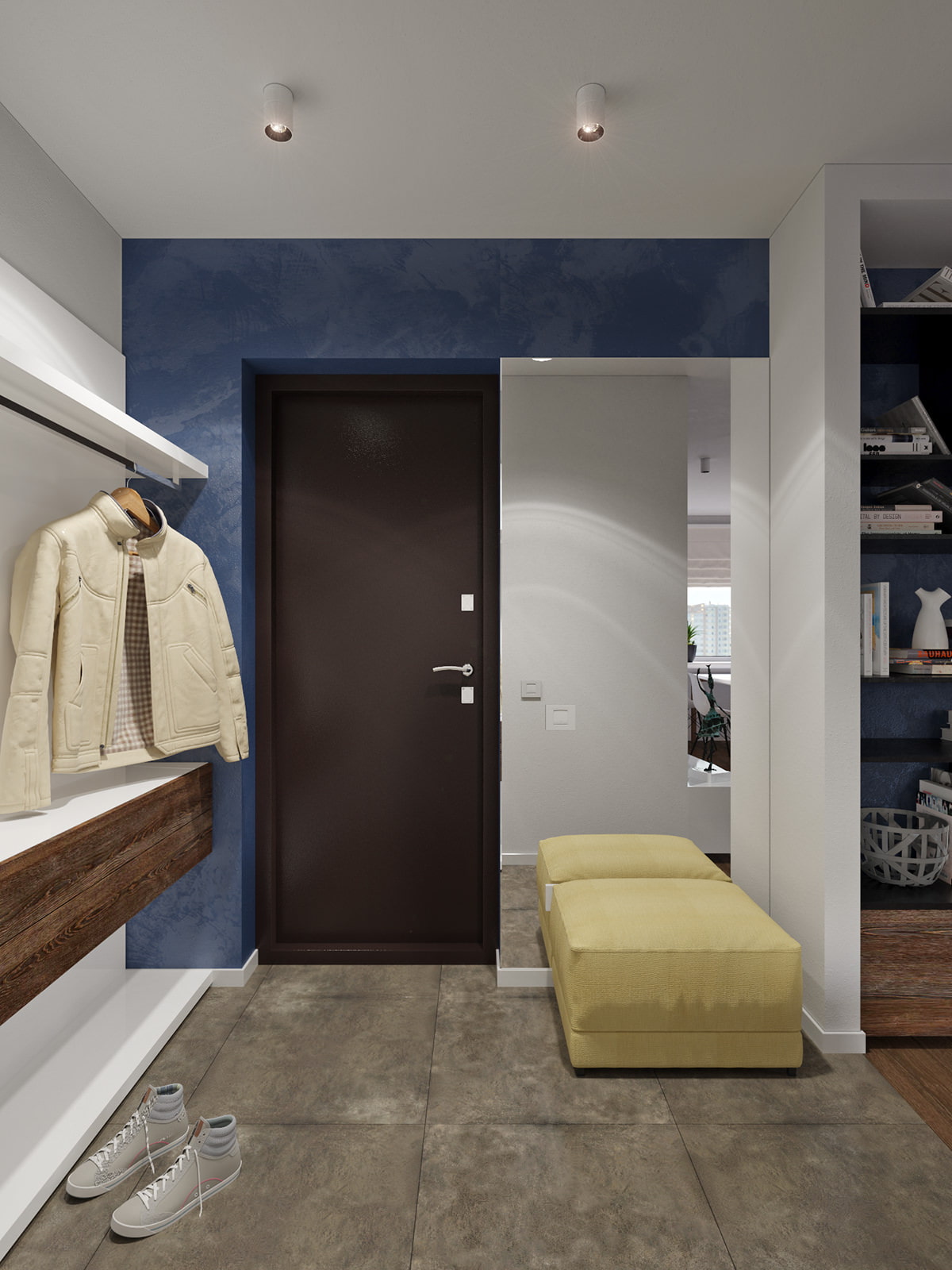 A small entrance hall in the interior of the studio is trimmed with light large-format tiles Estima - this allows you to visually increase its volume. Two SVL luminaires provide sufficient illumination - they are built into the ceiling.