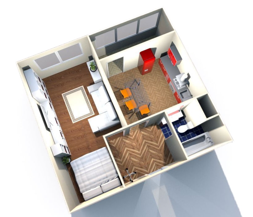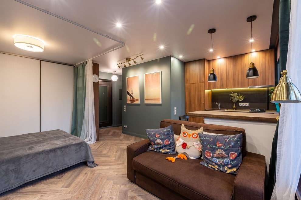 A small apartment, despite its footage, can be refurbished taking into account the interests of each family member: it can easily find room for three people. In accordance with the standard plan, the kopeck piece is equipped with a tiny kitchen, but if you remove the partition, it will easily turn into a euro-apartment building with a separate bedroom. Connoisseurs of space, bachelors or creative individuals will prefer to equip 42 sq. m. free studio apartment.