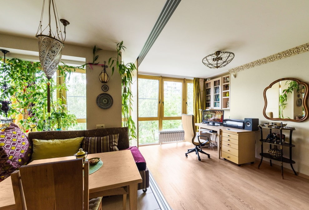 It is difficult to imagine a modern apartment without a workplace. But where to find free meters for him? To fit a table with a computer and a chair, any cozy corners next to the outlet, as well as a window seat and, of course, an insulated balcony, will do. A full and luxurious study can be organized in a bay window, separating it with curtains or furniture.