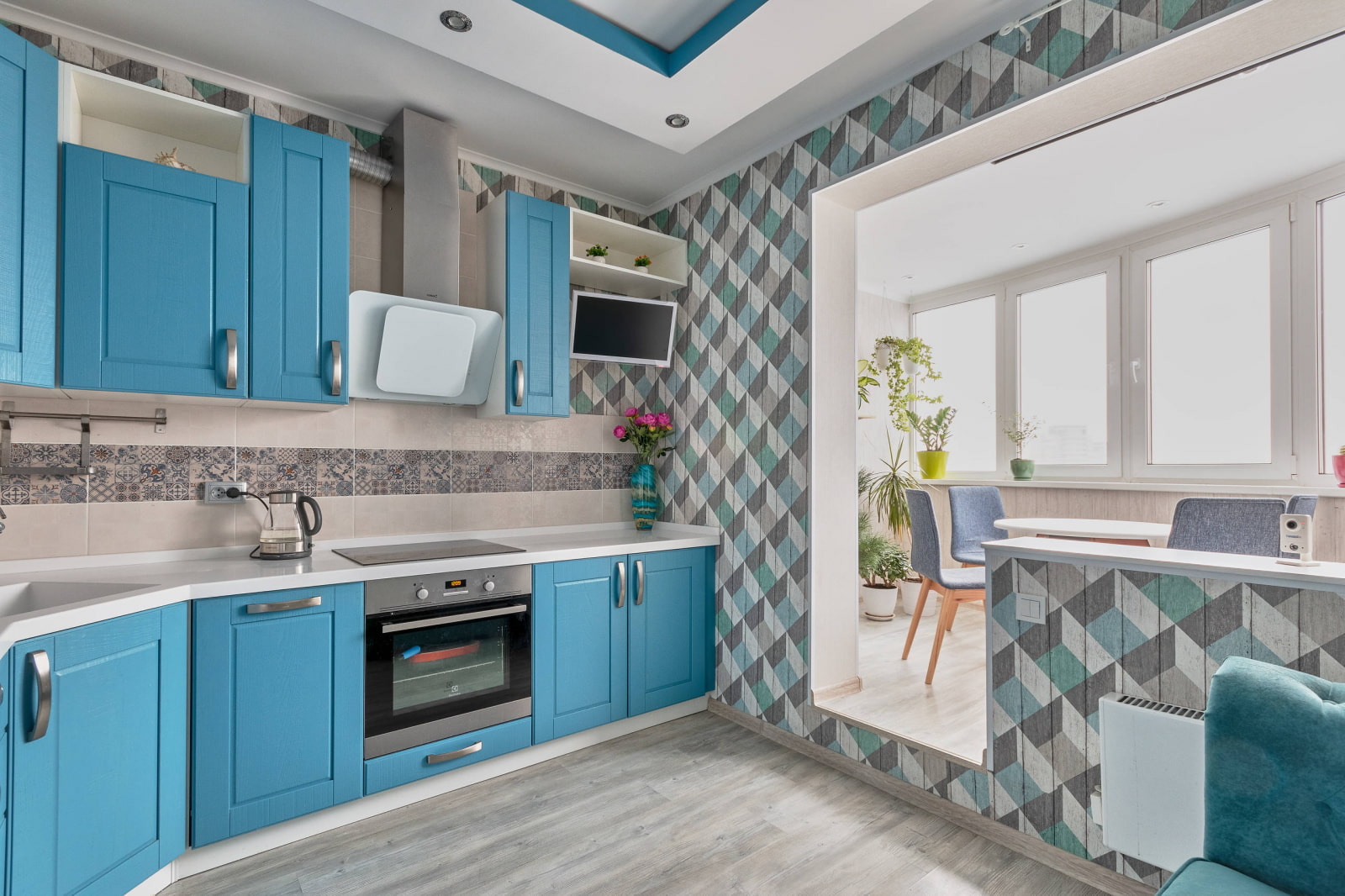 A great option for a kitchen with access to the balcony is the arrangement of a dining area in additional space. If you insulate the loggia and connect it to the kitchen, you get a great dining room.