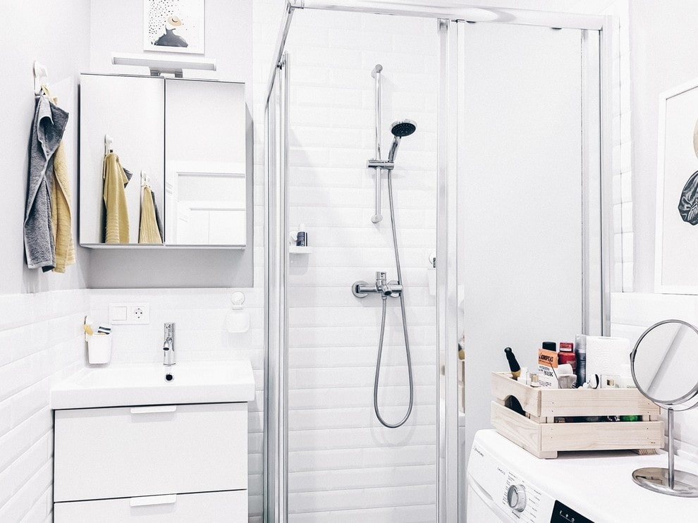 The photo shows the ideal bathroom in terms of ergonomics: white glossy tiles, glass shower cubicle, mirror, compact furniture and using the surface of the washing machine as a worktop.