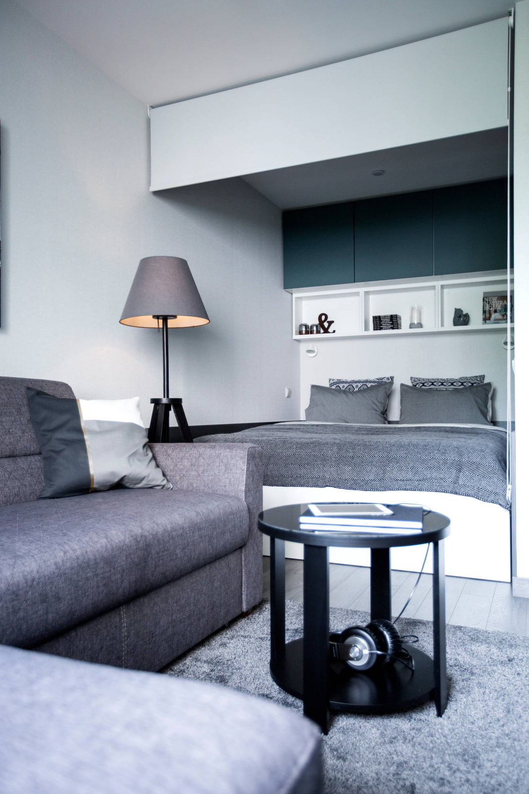 A niche is a good option for a sleeping place: a cozy compact space gives a feeling of privacy and security, especially if you zone the bed with curtains or a roller blind. In a shallow niche, you can equip an office or hide a closet there.