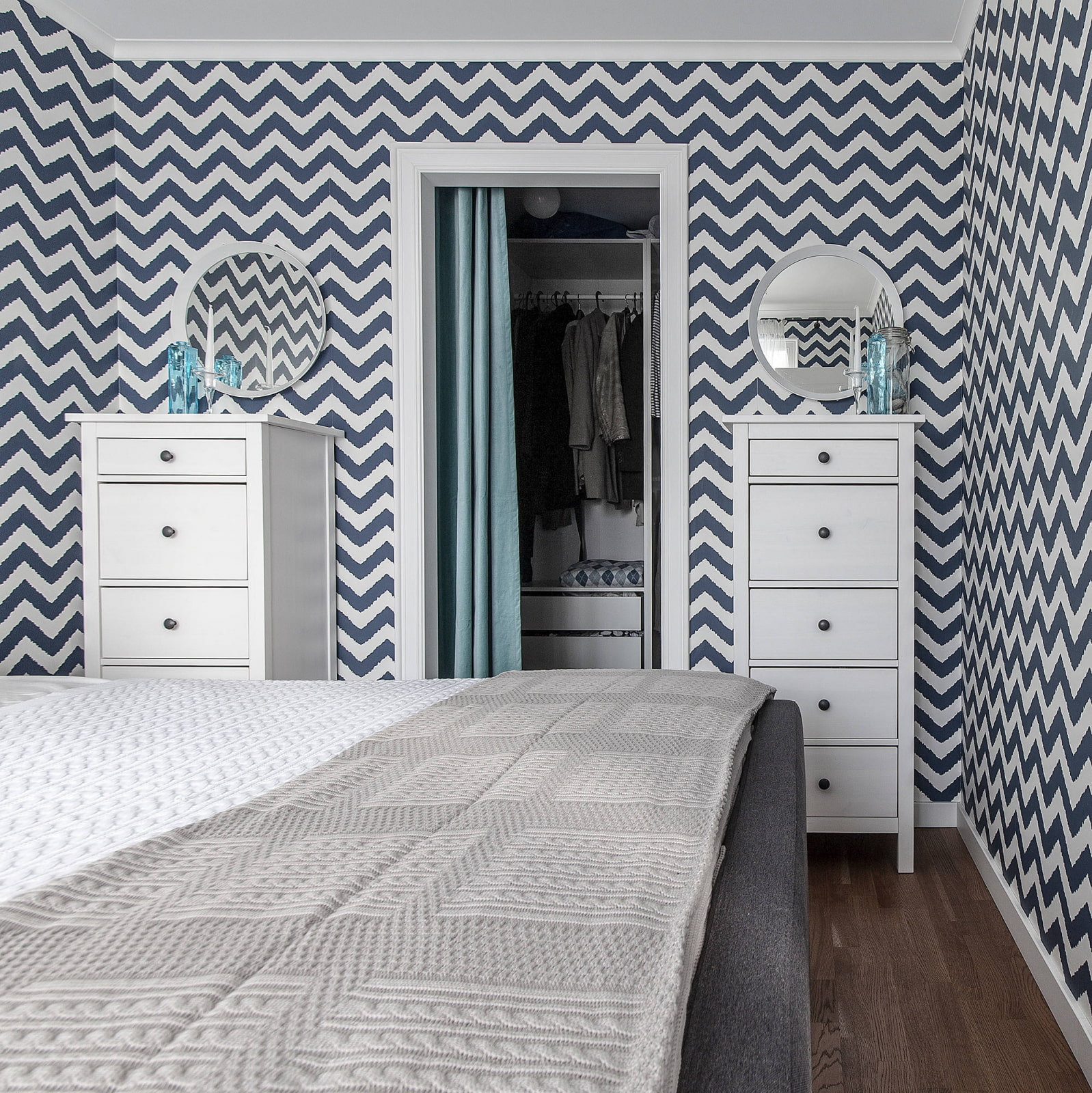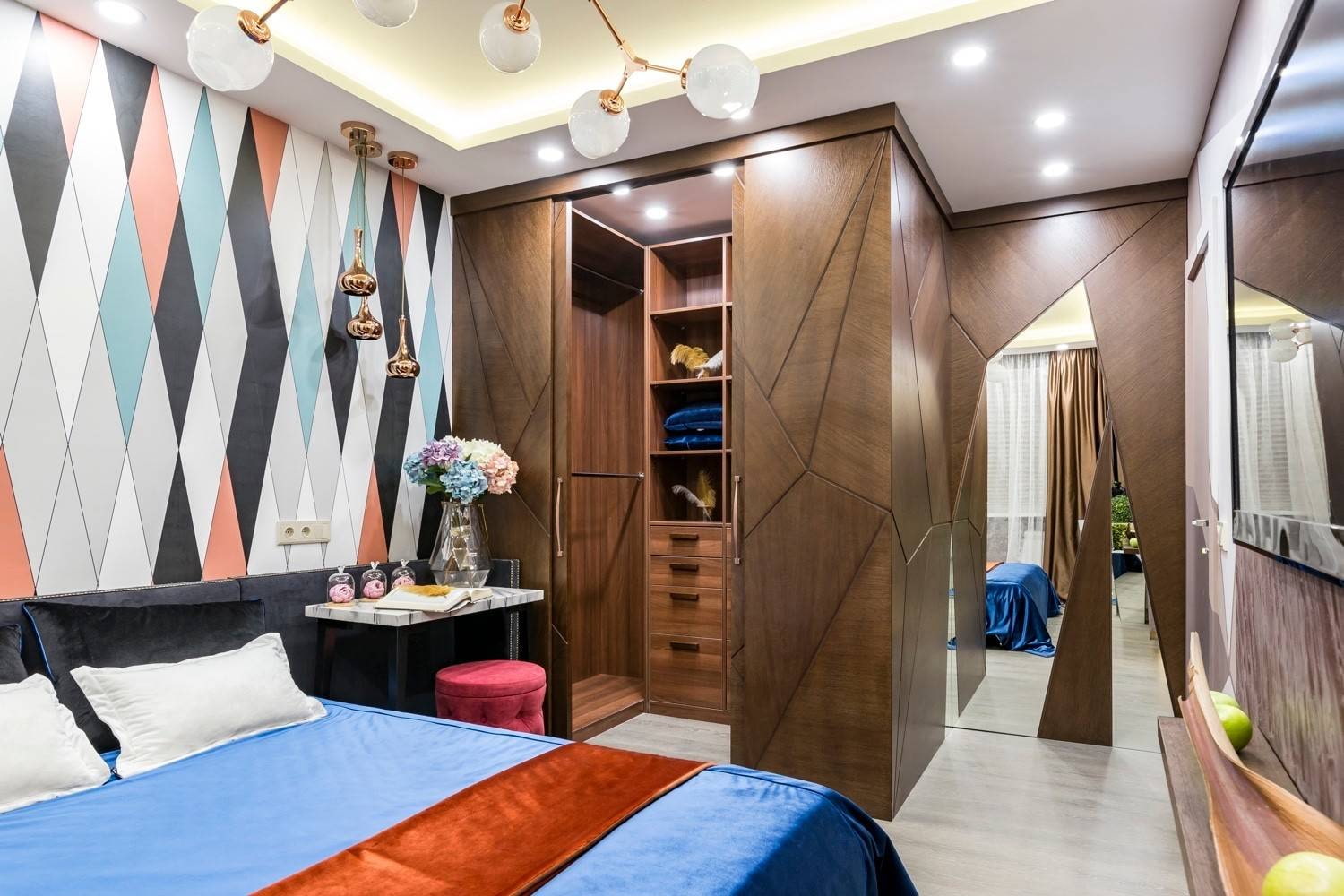 Everyone dreams of a comfortable bedroom, but if there is not so much space, there is a special use for the bed. Sometimes in a small room there is only enough space for a bed and a wardrobe. In this case, the storage system can fit on a narrow wall, taking up space from floor to ceiling. Glossy push-to-open fronts do not require fittings. The gaze will not cling to a bulky cabinet, as it will become, as it were, part of the wall.