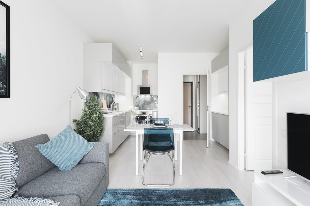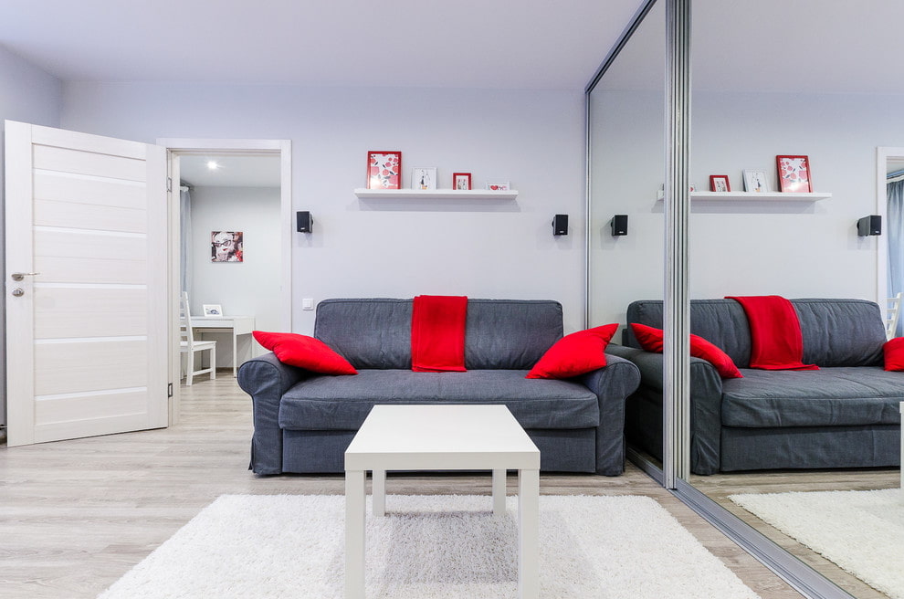 A place for receiving guests in an apartment of 42 sq. meters can be equipped with a straight or corner sofa. A living room with a coffee table looks especially cozy, but free space will be required to place it.