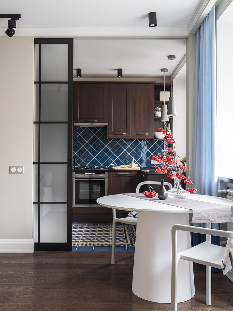 Not everyone is comfortable when the kitchen is in a residential area, so many Khrushchev owners prefer to have a small but separate place for cooking and eating. A cramped kitchen is equipped with compact or folding furniture, tall and spacious wall cabinets with glossy facades, as well as mirrors that increase space and light.