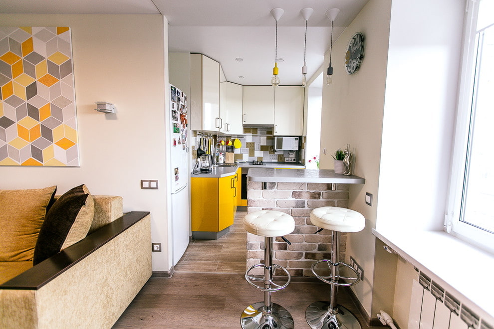 In a small kitchen, combined with a room, it is much easier to place everything you need, since the dining area is taken out into the vacant opening. In this case, the kitchen-living room becomes a comfortable place to relax and eat. In a small kitchen (if we are talking about a kopeck piece of 42 square meters), you should use a whole arsenal of tools in order to fit everything you need: