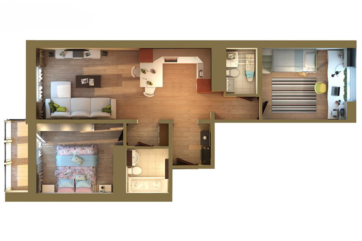An apartment with a good layout is considered to be a vest, when the kitchen and the corridor are located between two rooms. At the same time, the windows face different sides. The absence of common walls makes it possible to live in an apartment without interfering with each other.