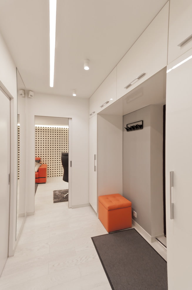 In order not to overload the living space with cabinets, you can equip a storage system for all clothes and other necessary things in the corridor. Skirting the front door, the mezzanines save space, and full-length mirrors seem to enlarge the room. The hallway can also function as a dressing room.